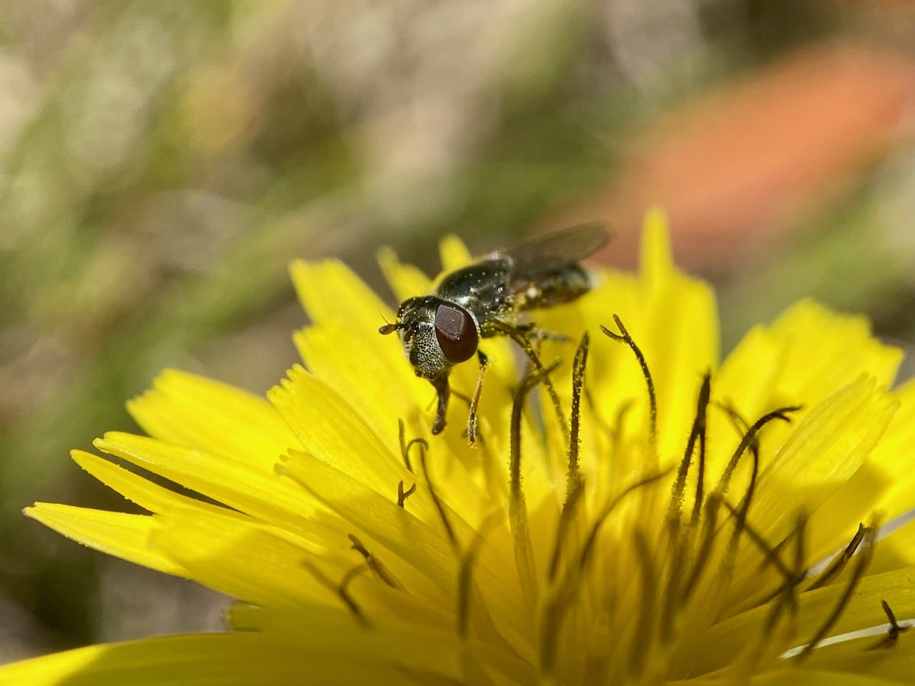 A Sedgesitter, Platycheirus sp. (family Syrphidae) is feeding on pollen on a flowerhead of Bristly Oxtongue, Helminthotheca echioides.