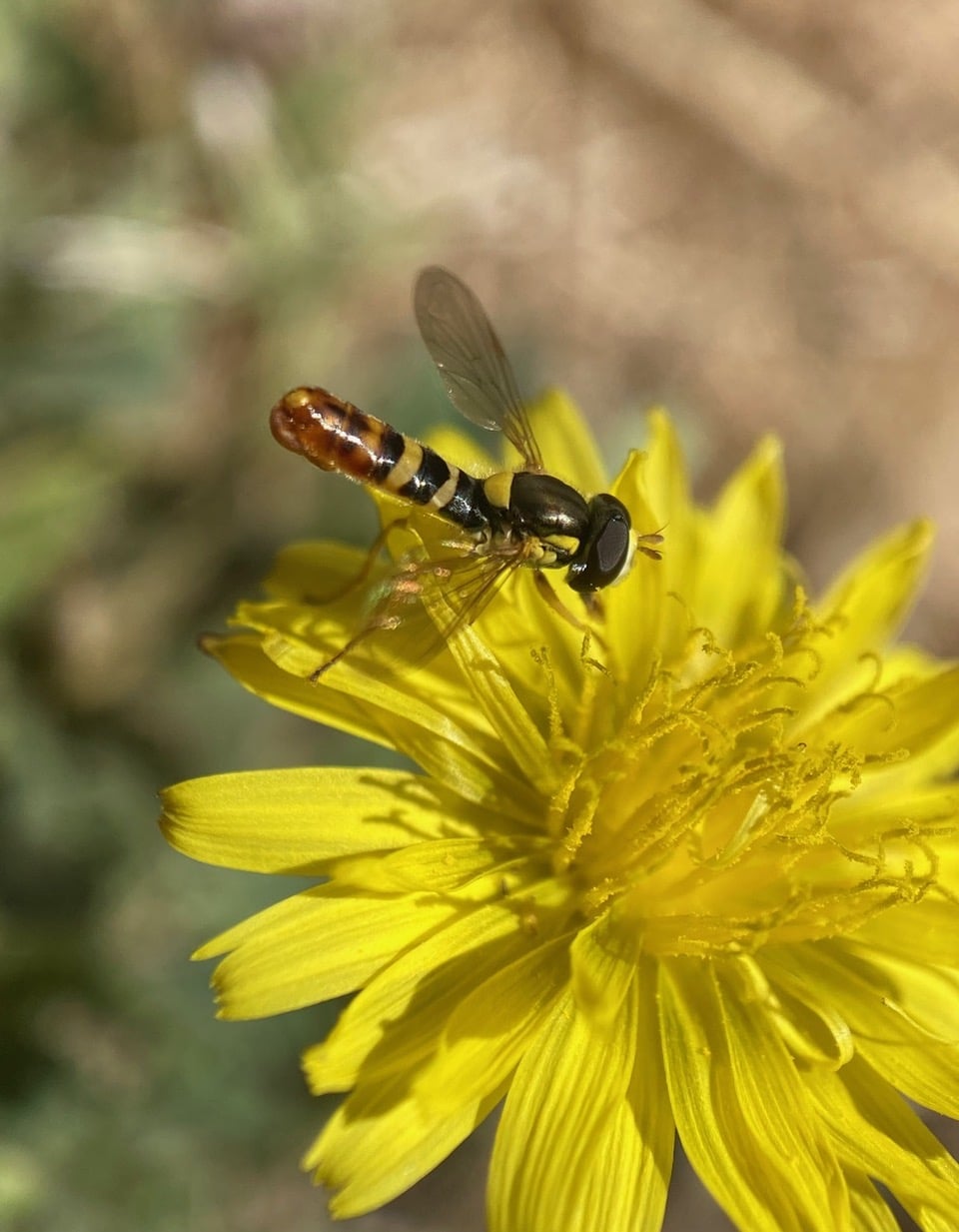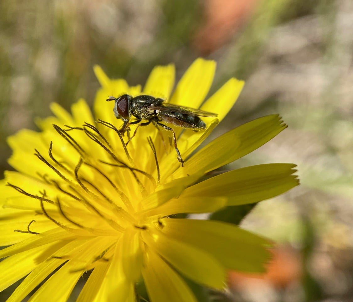 A male Forked Globetail, Sphaerophoria sulphuripes (family Syrphidae) has landed on a Catsear flowerhead.