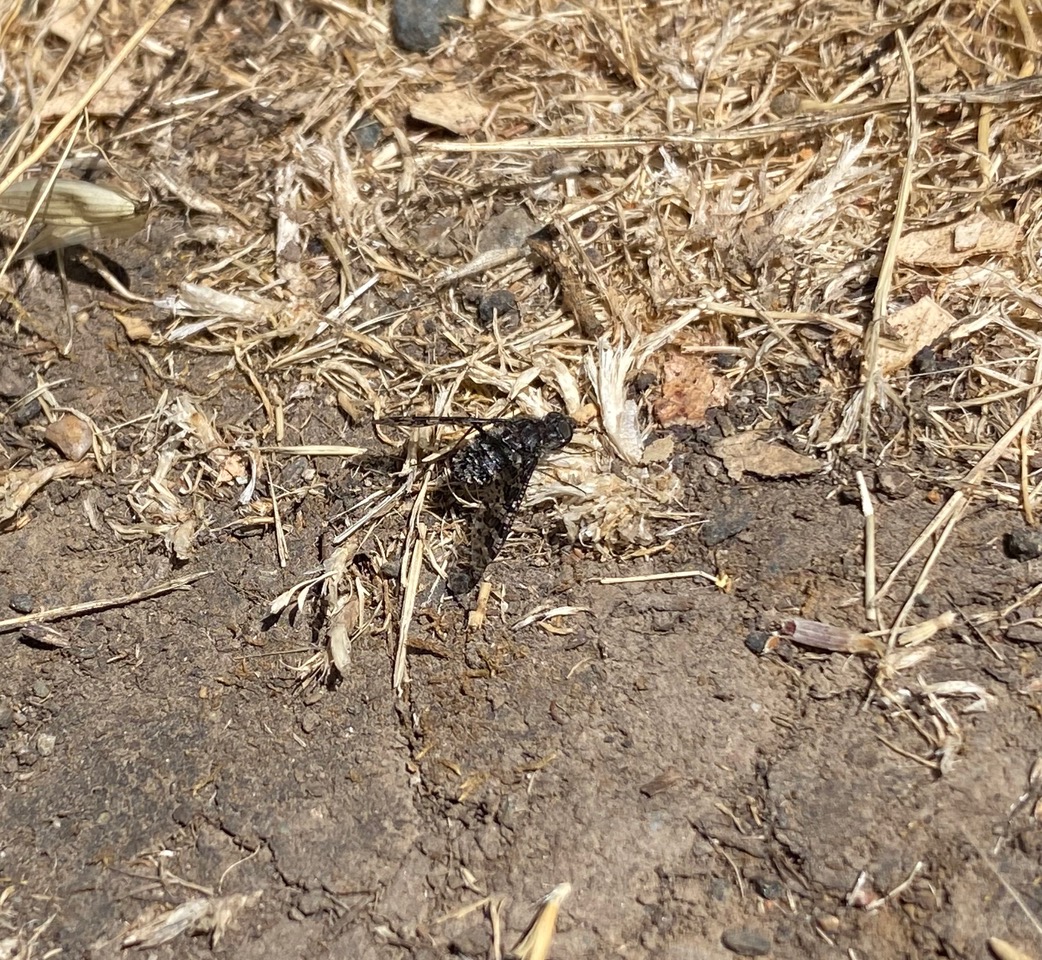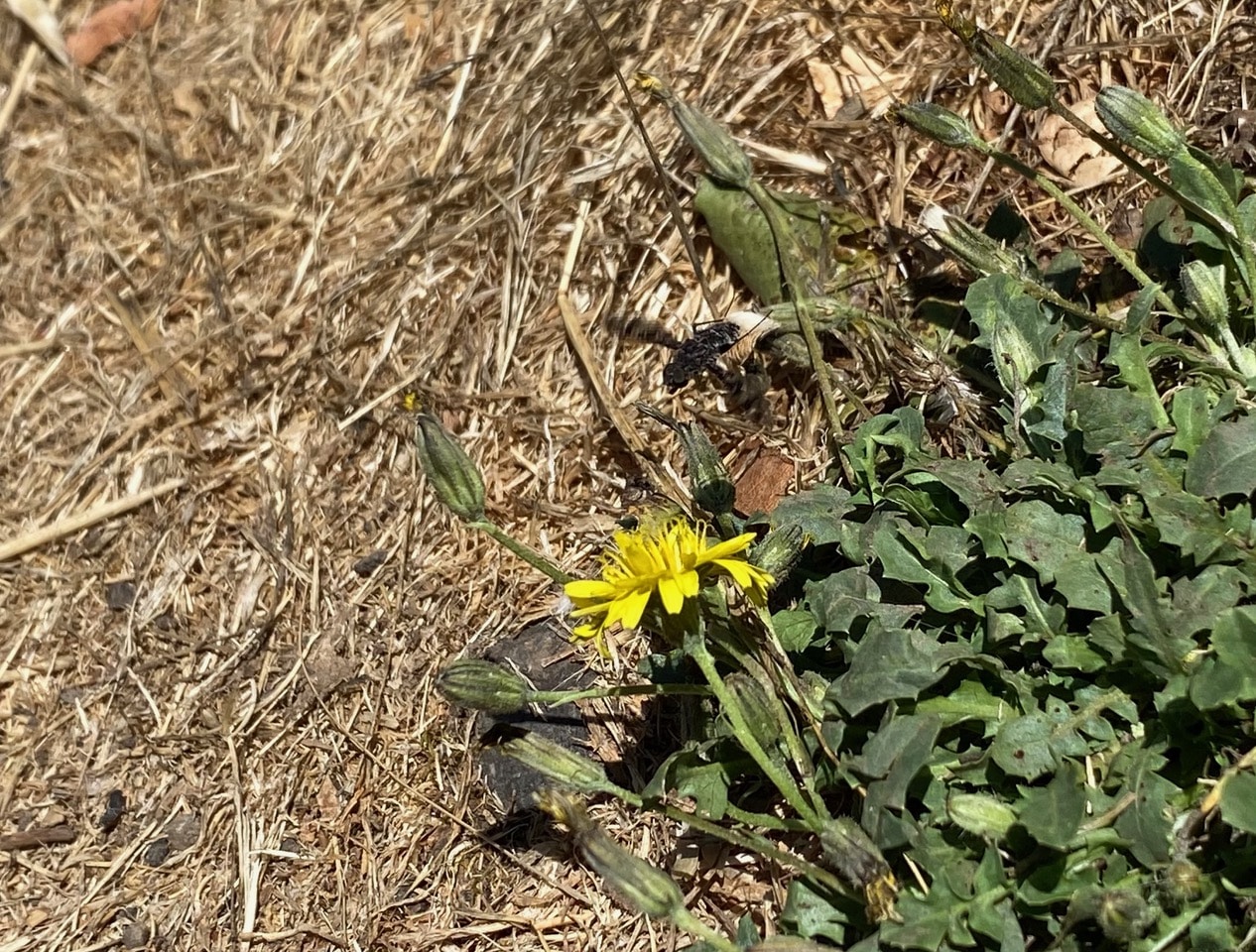 I watch as the same Bee Fly hover over three Catsear flowerheads in quick succession, taking a break on the ground after each bout of feeding. Even when the fly is staying still, it is hard to make out its outline. It has dark, heavily spotted wings and its body appears to be covered with black and gray scales. iNaturalist has helped identify the Bee Fly as a member of the genus Lepidanthrax (family Bombyliidae).