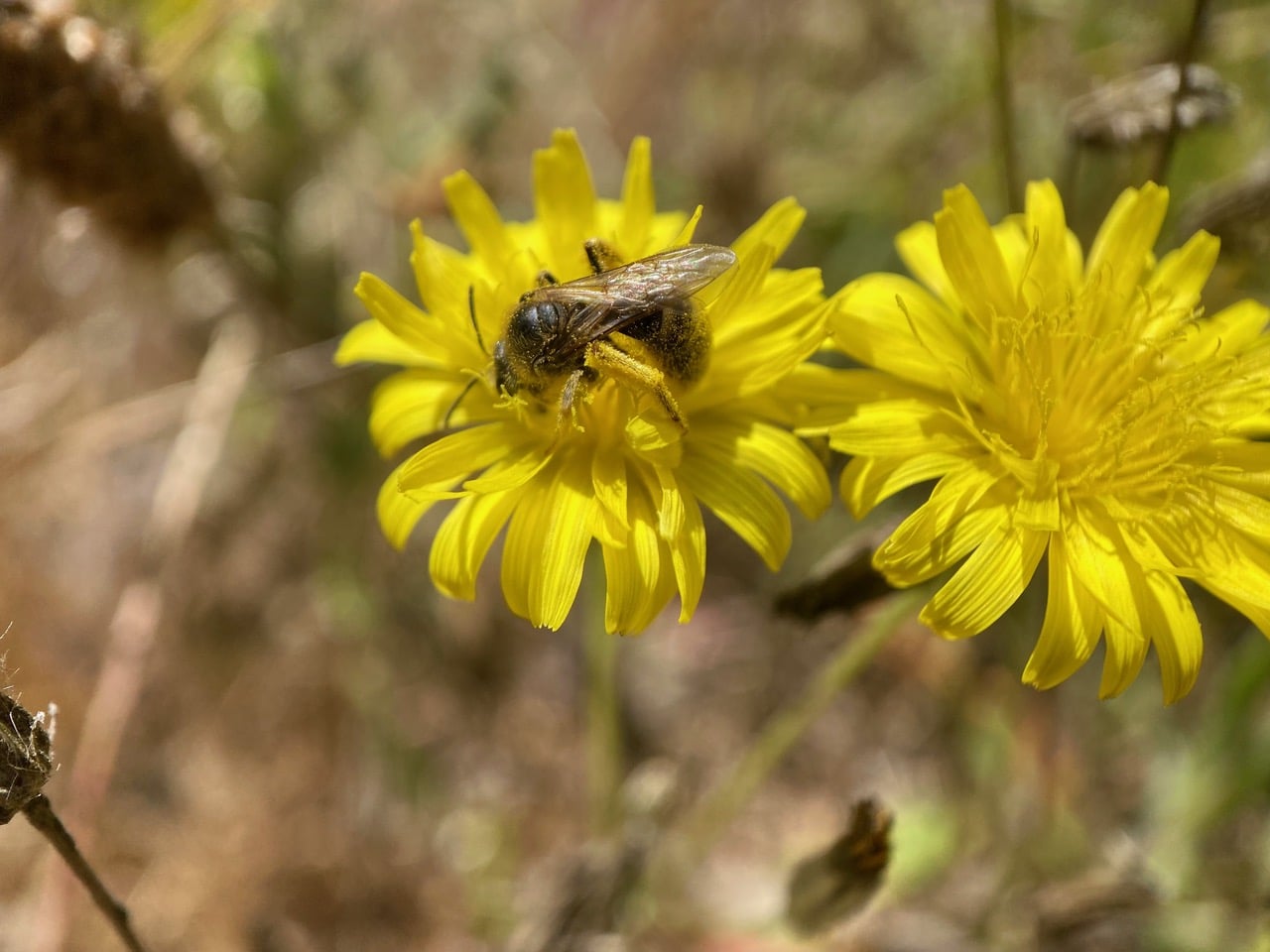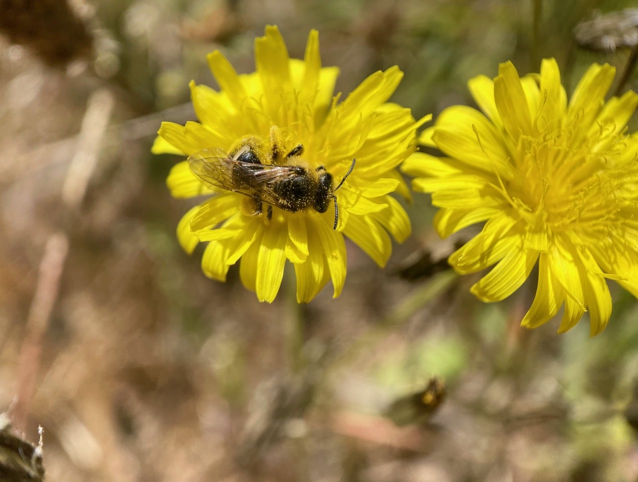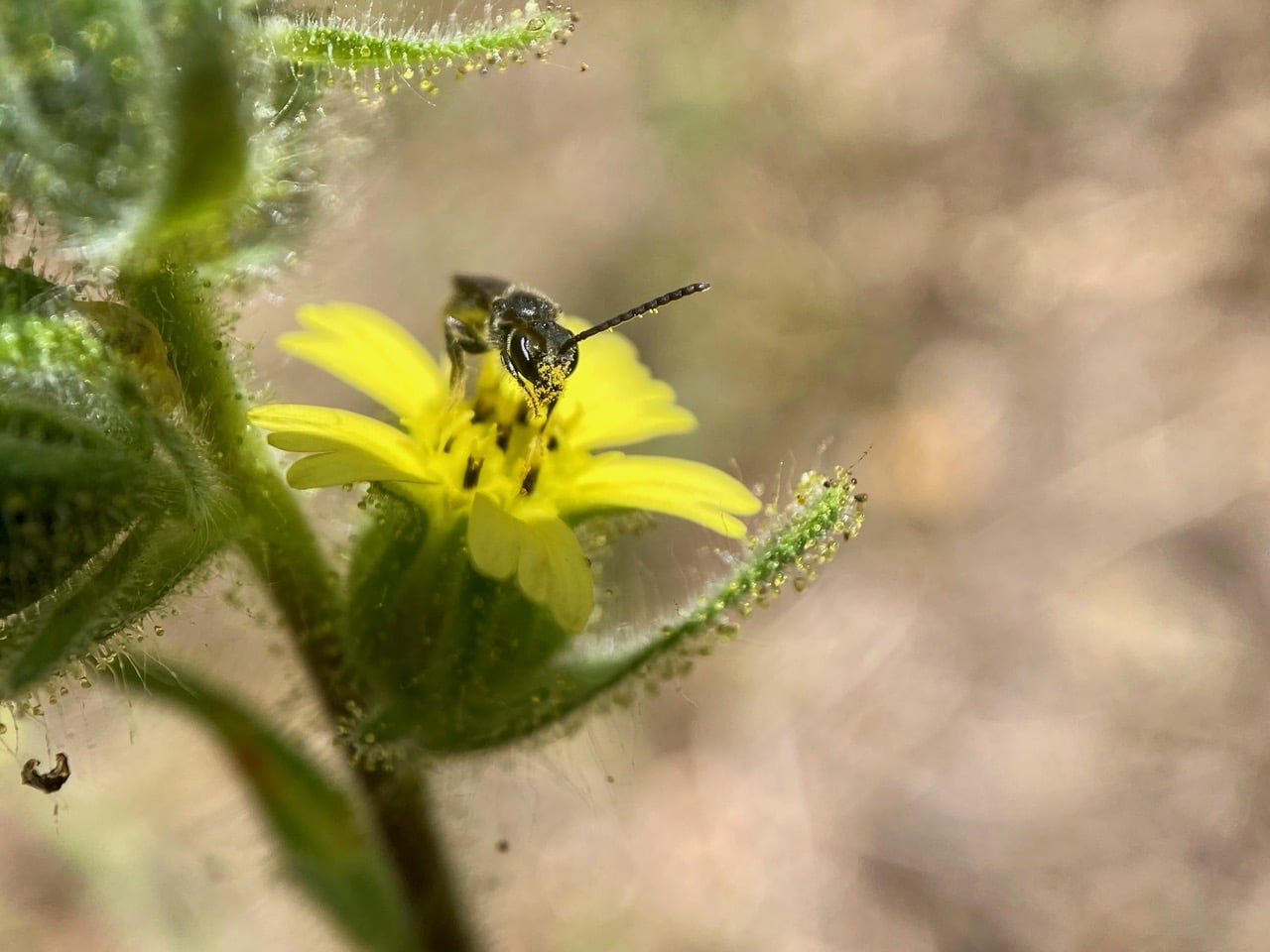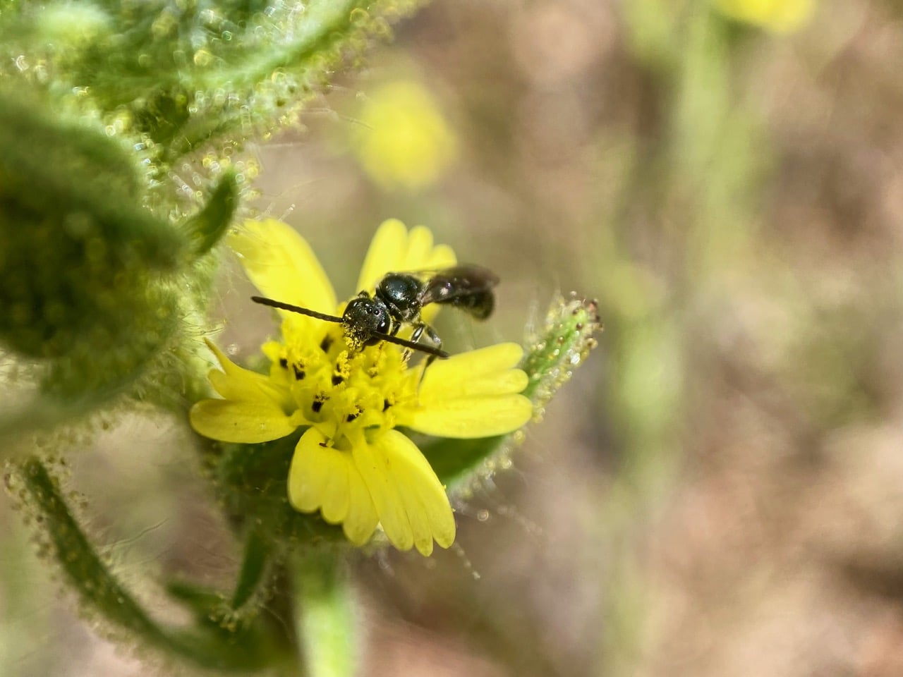 The sticky pollen of the tarweed flowers has adhered to the face and antennae of the bee. Although male bees do not intentionally collect pollen, their hairy bodies often transfer pollen from flower to flower as they seek nectar, making them good pollinators.