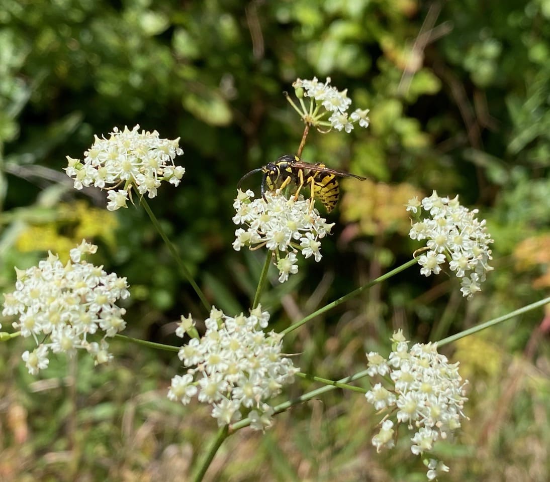 There are so many Yellowjackets foraging on the Yampah flowers I have to give up looking for caterpillars of the Anise Swallowtail butterfly. It is hardly likely that any caterpillars would survive this onslaught of the carnivorous wasps constantly on the look out for caterpillars to feed their young. See the umbel that has been partially eaten on the upper right with a brown, scarred stalk? Those are tell-tale signs that an Anise Swallowtail caterpillar has been feeding there before.