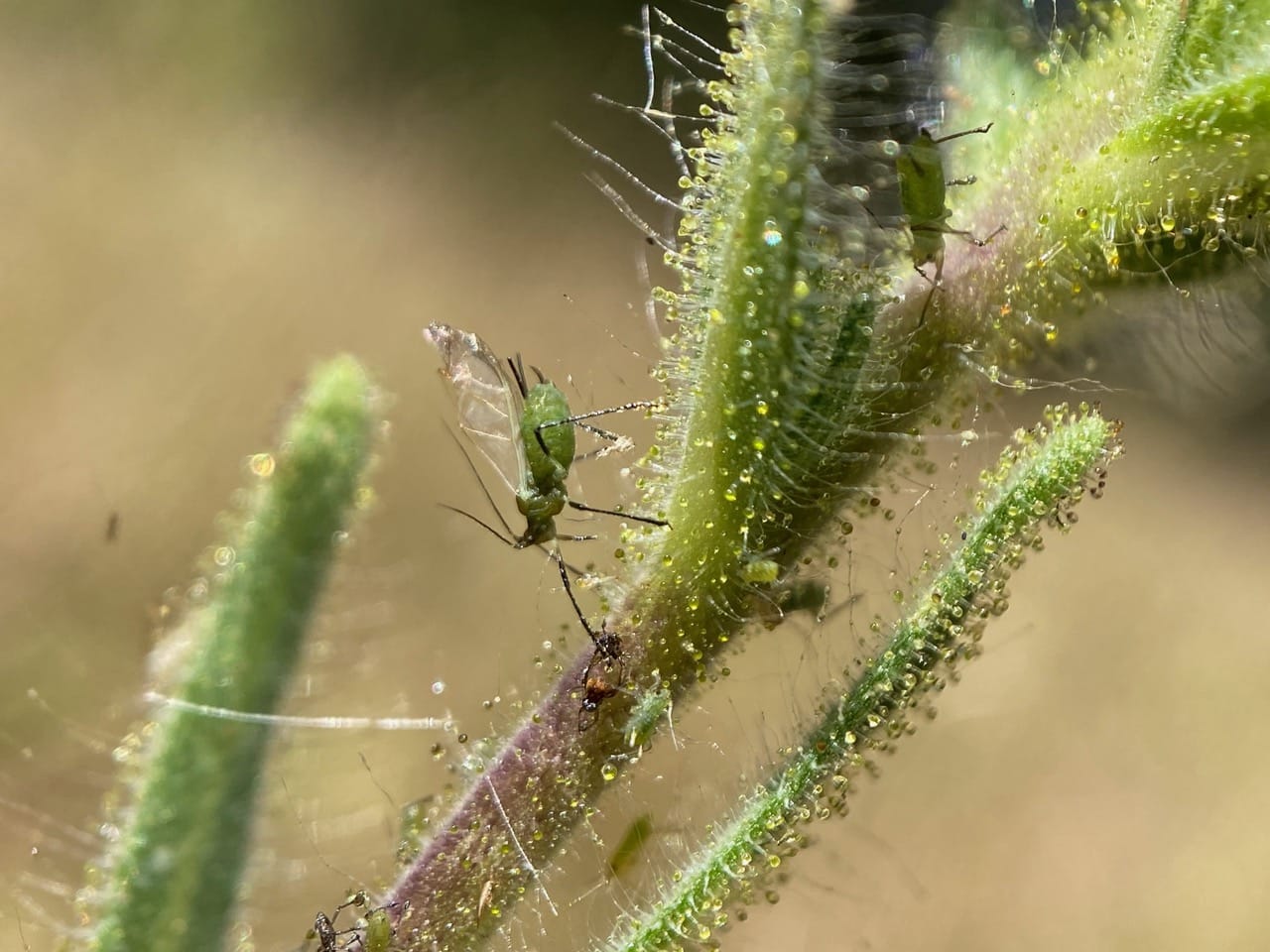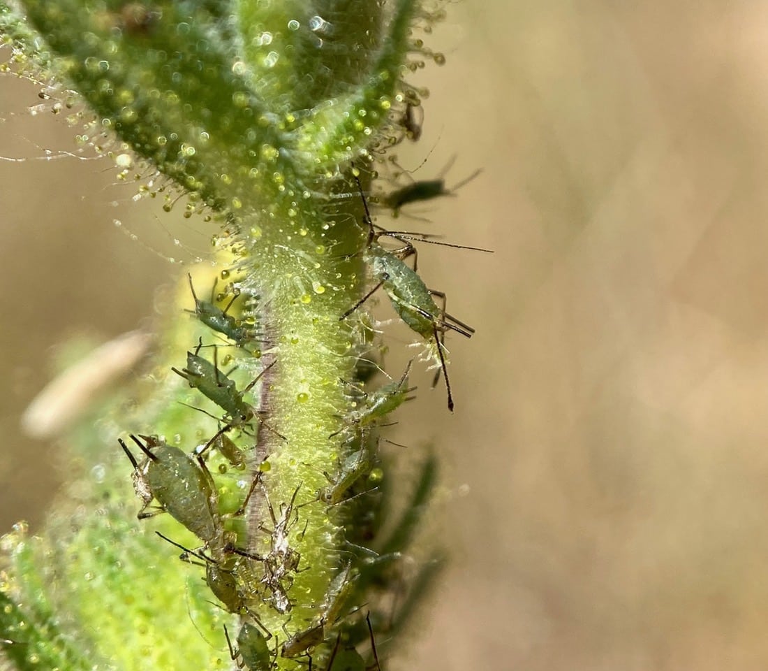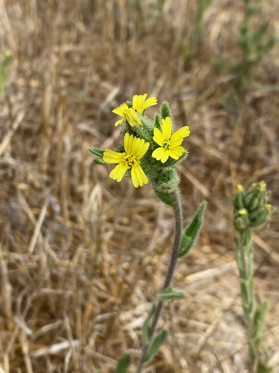 This Coast Tarweed is infested with aphids in the genus Macrosiphum (family Aphididae). Even these tiny insects are amazingly tolerant of the sticky tarweed exudates.
