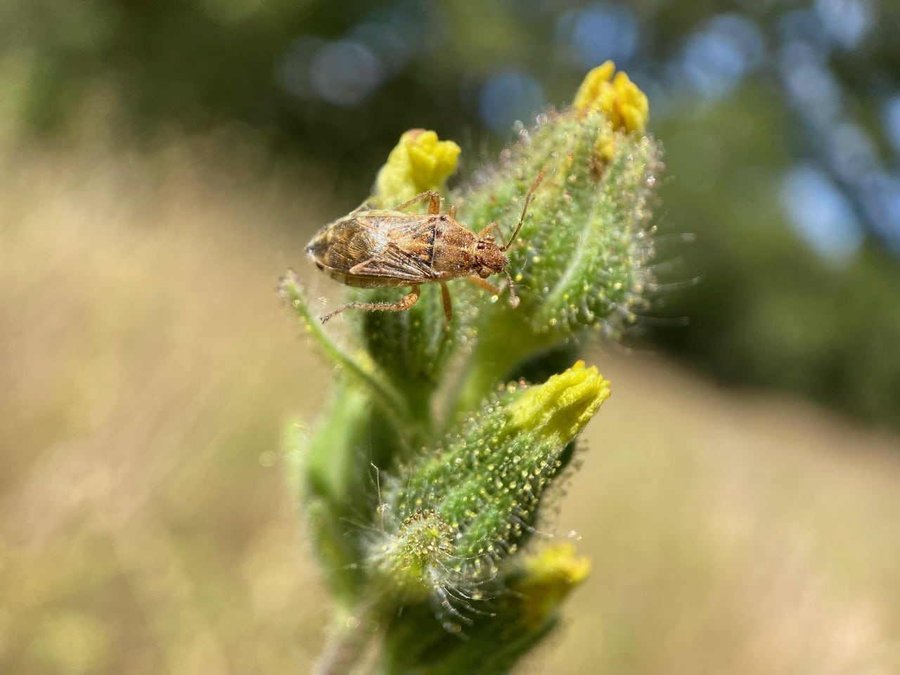 A Carrot Plant Bug, Orthops scutellatus (family Miridae) surveys the surrounding areas from an immature flowerhead of Coast Tarweed. I always wonder how these bugs manage to navigate the sticky terrain of tarweed without getting stuck.