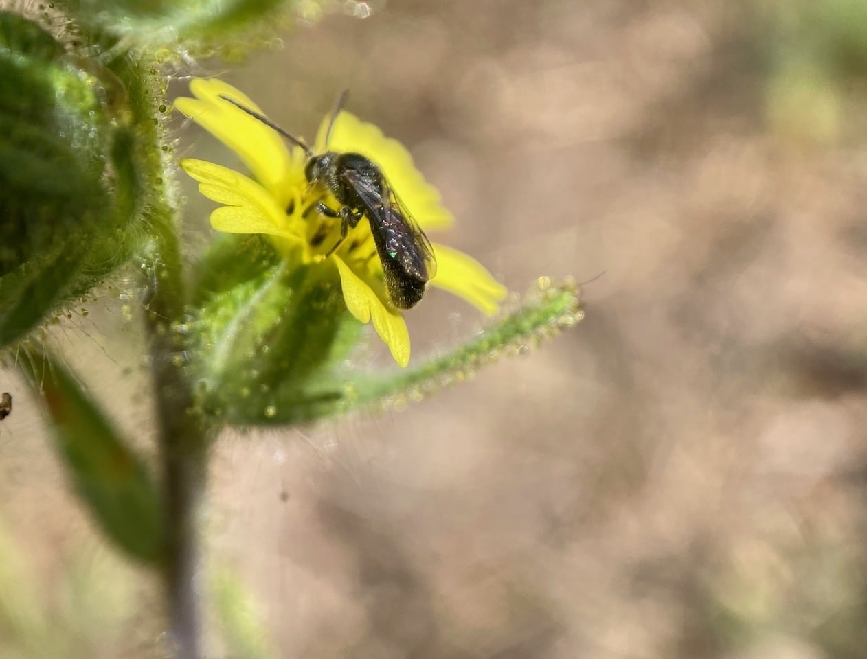 A male Sweat Bee (family Halictidae) has landed on a tarweed flowerhead to take nectar. Note his long antennae, slender build, and absence of scopae on his hind legs.