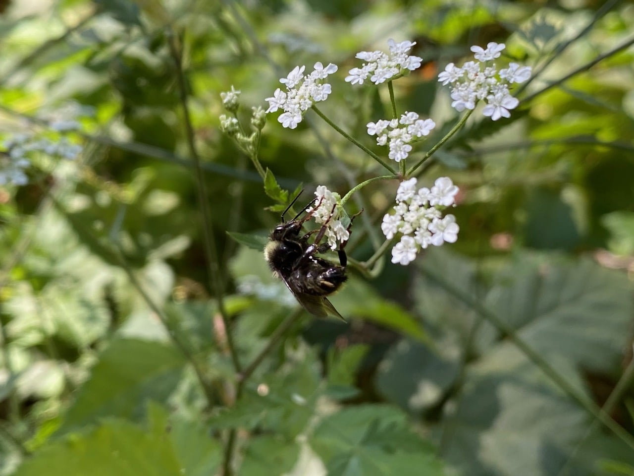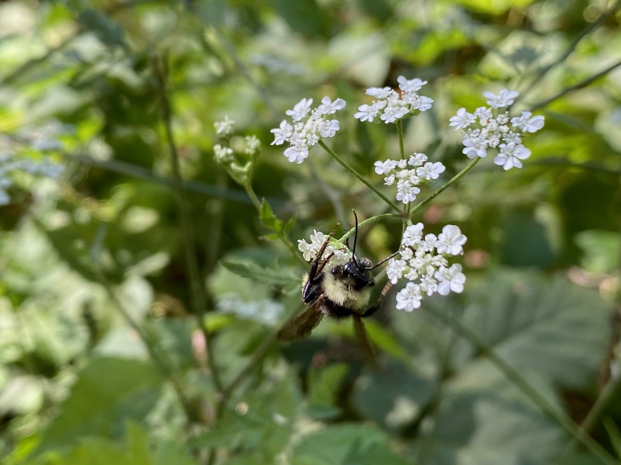 Its long tongue extended, a small bumble bee is taking nectar from an umbel of Torilis flowers.