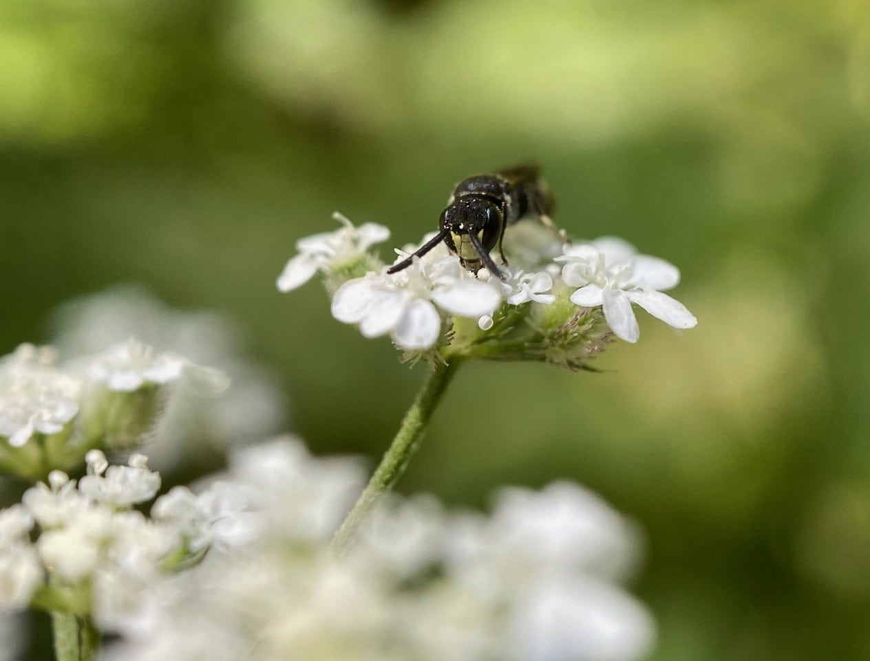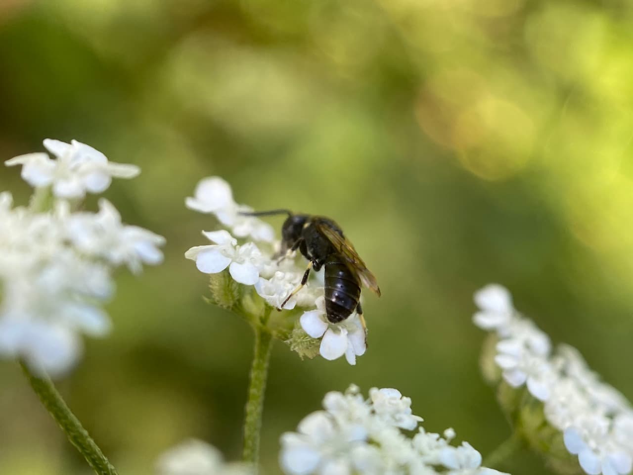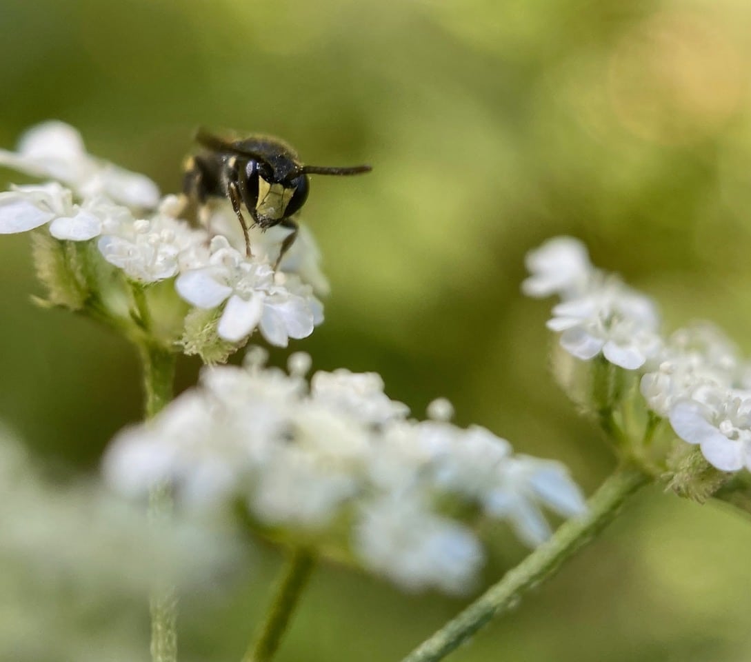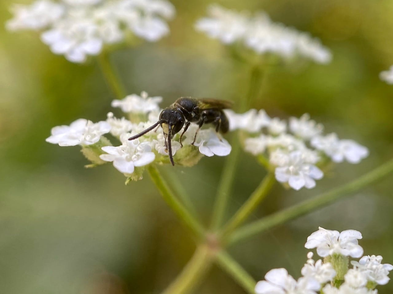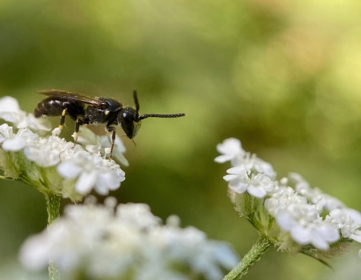 A tiny bee lands on an umbel of Torilis flowers. From its long antennae, I gather that it is a male. From its size and the yellow markings on its legs, I gather that it is probably a Masked Bee, Hylaeus sp. (family Colletidae).