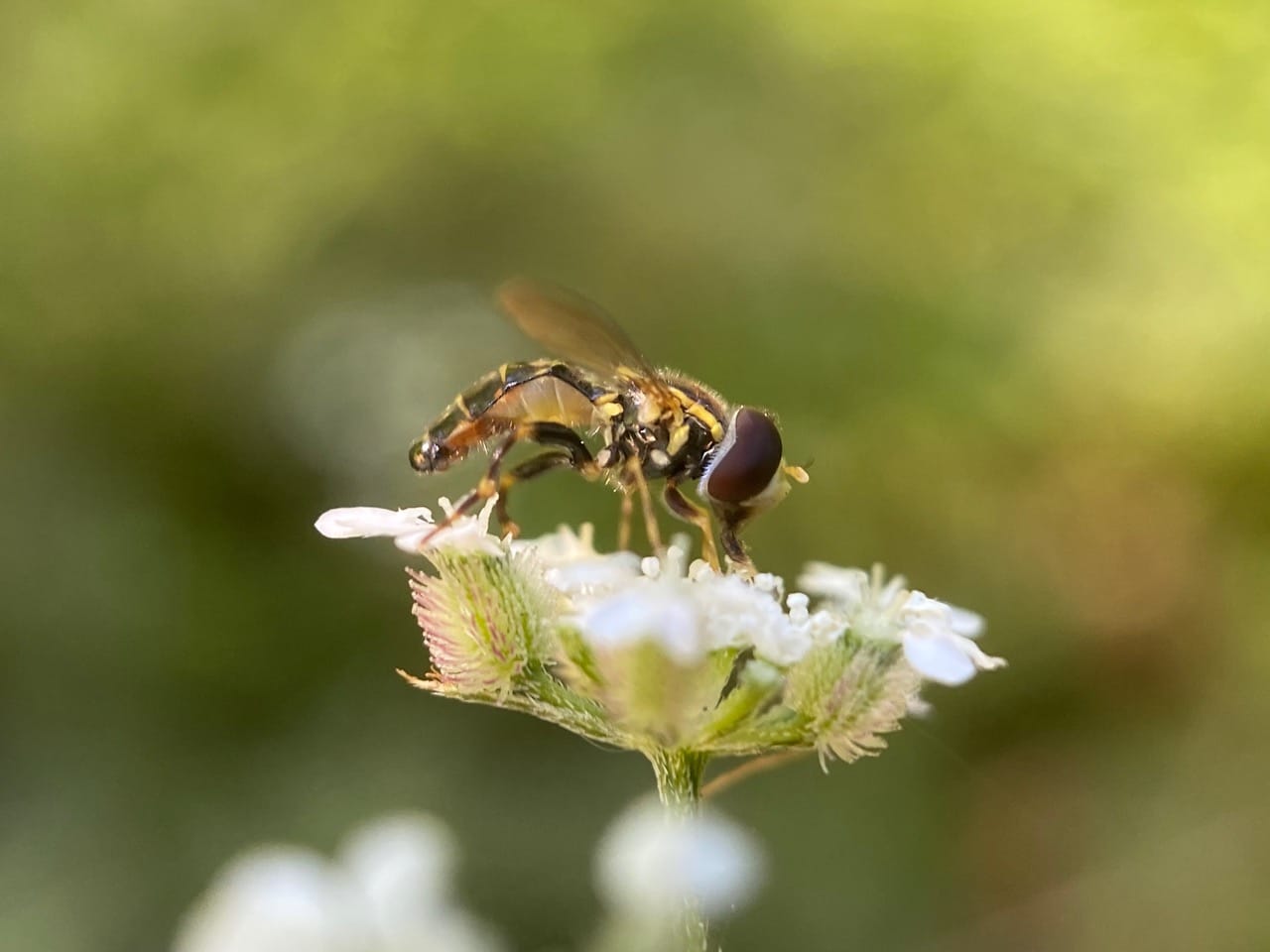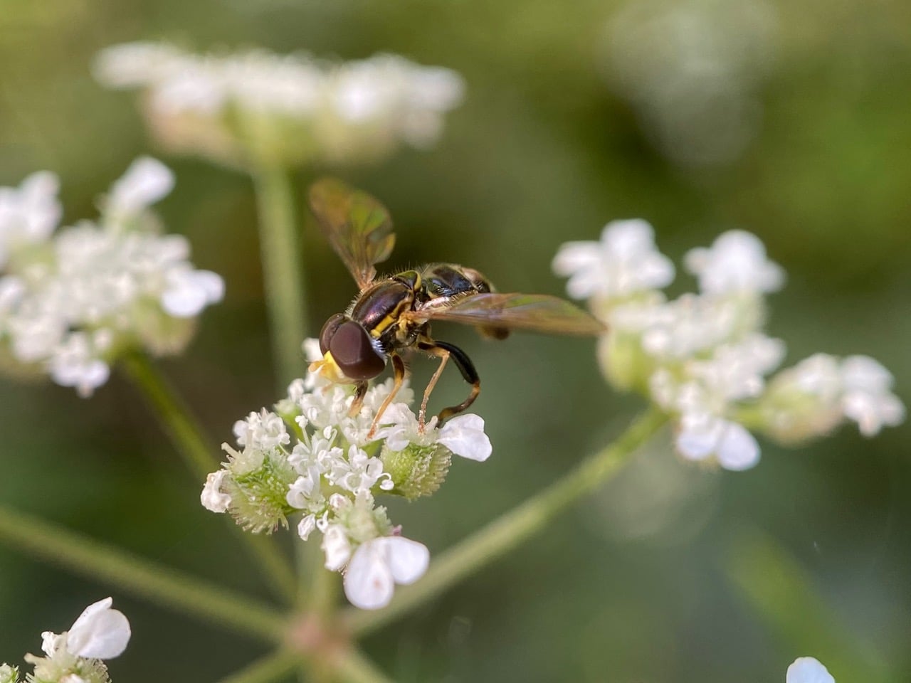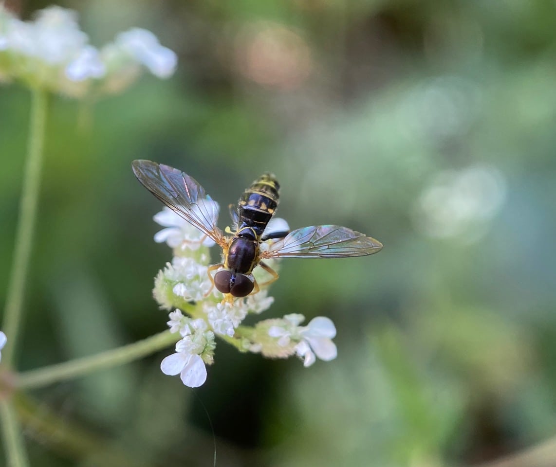 A tiny hover fly has landed on an umbel of Torilis flowers. It is male, as evidenced by its holoptic eyes that meet on top of the head.