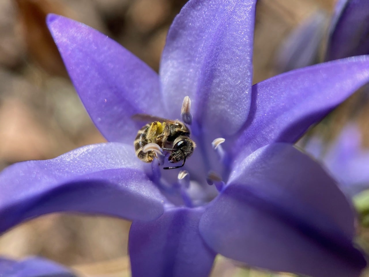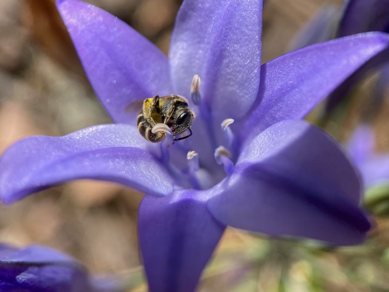 There’s now a bit of sky blue pollen on the bee’s scopa. It is slow, hard work!