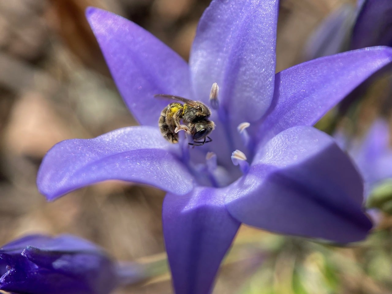 A similar bee is collecting pollen from one of the six stamens on another Ithuriel’s Spear flower. The bee is a Tripartite Sweat Bee, Halictus tripartitus (family Halictidae). The bee has a bit of yellow pollen on the scopa of her hind legs. She must have gathered that from some other flower. Ithuriel’s Spear’s pollen is blue. The Tripartite Sweat Bee is a generalist forager, able to gather floral resources from a wide range of flowers. This versatility, as well as their social organization contribute to the species’ phenomenal success in our area.