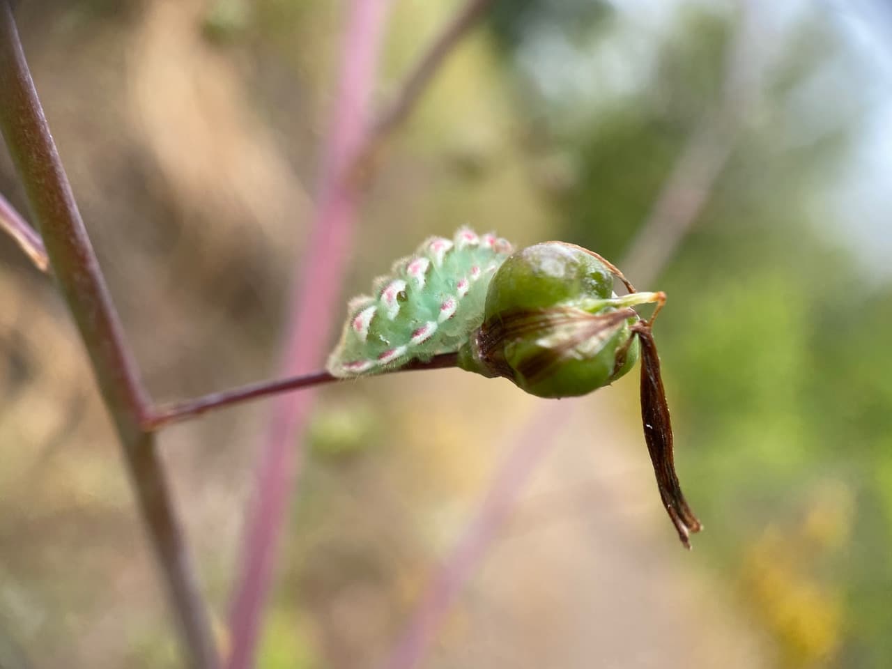 Ah, I finally locate the caterpillar on an adjacent branch, on a developing fruit.