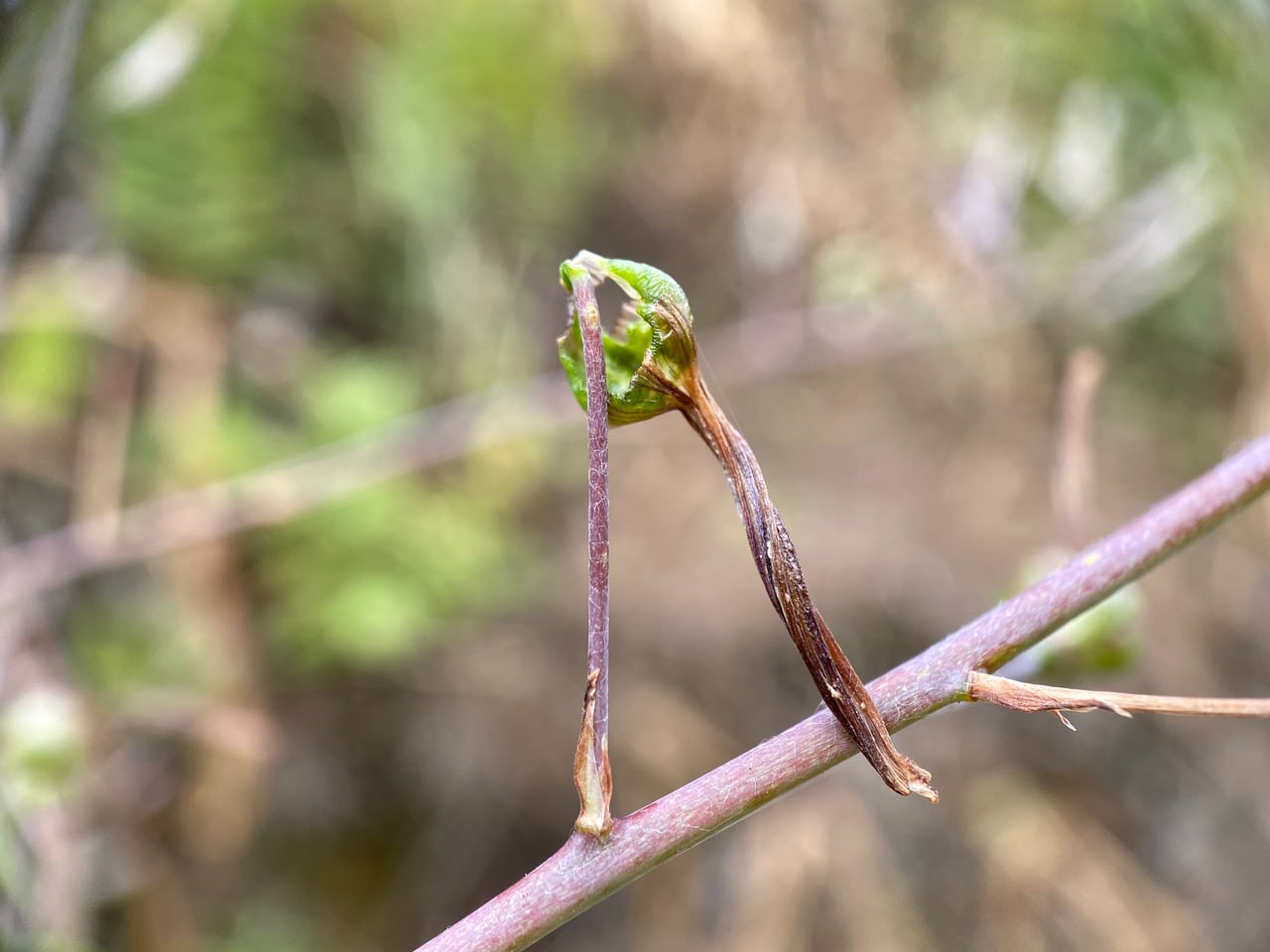 As I pass the Soap Plant that I have marked, I stop to check for the Brown Elfin caterpillar, Callophrys augustinus (family Lycaenidae). It is not on the branch where I found it earlier, but it has left a couple of hollowed out fruits on the branch. Surely the caterpillar must still be on the plant – it couldn’t have gone far. I search the plant thoroughly, branch by branch, flower by flower. Nada! Then I decide to shift my position and view the plant from a different angle.