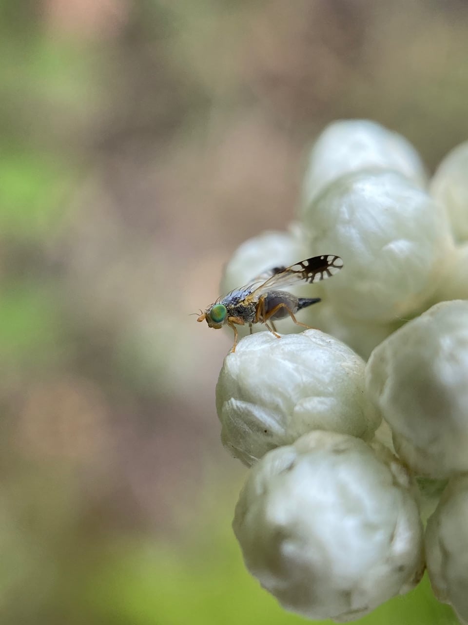 This female Fruit Fly, Trupania sp. (family Tephritidae) is always found on the immature flowerheads of the California Everlasting, Pseudognaphalium californicum. Why? Is she here to lay her eggs?
