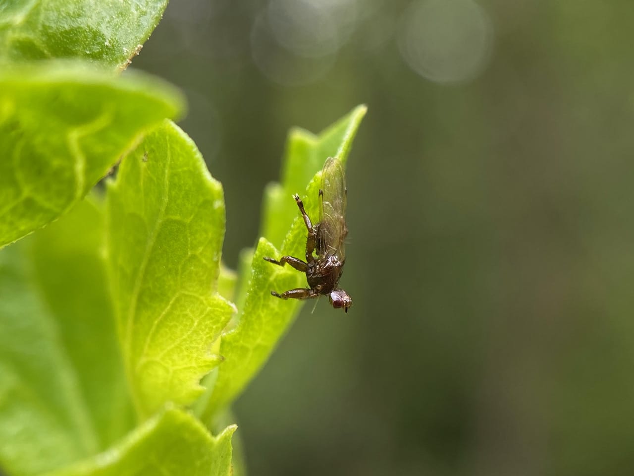 A fly in the family Lauxaniidae has come to investigate the dead caterpillar.