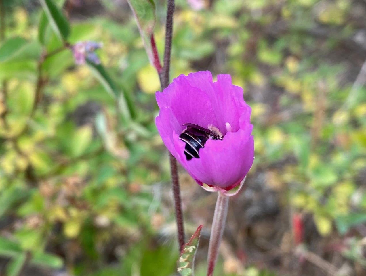 5:50 pm. We pass the same Clarkia rubicunda flower that hosted the sleeping bee. In just a little over an hour, the flower looks quite different now that it is partially closed. I peek inside – the bee is still there, tucked in more snuggly, sheltered from the cold winds. Now that I can clearly see the white bands on the black abdomen, I am almost sure that it is a Digger Bee, Anthophora sp. Nite-nite, Bee!