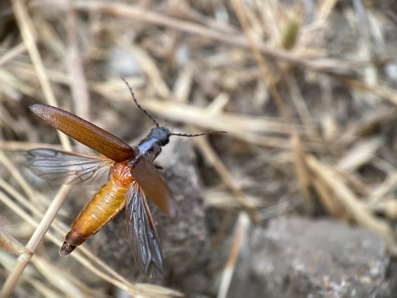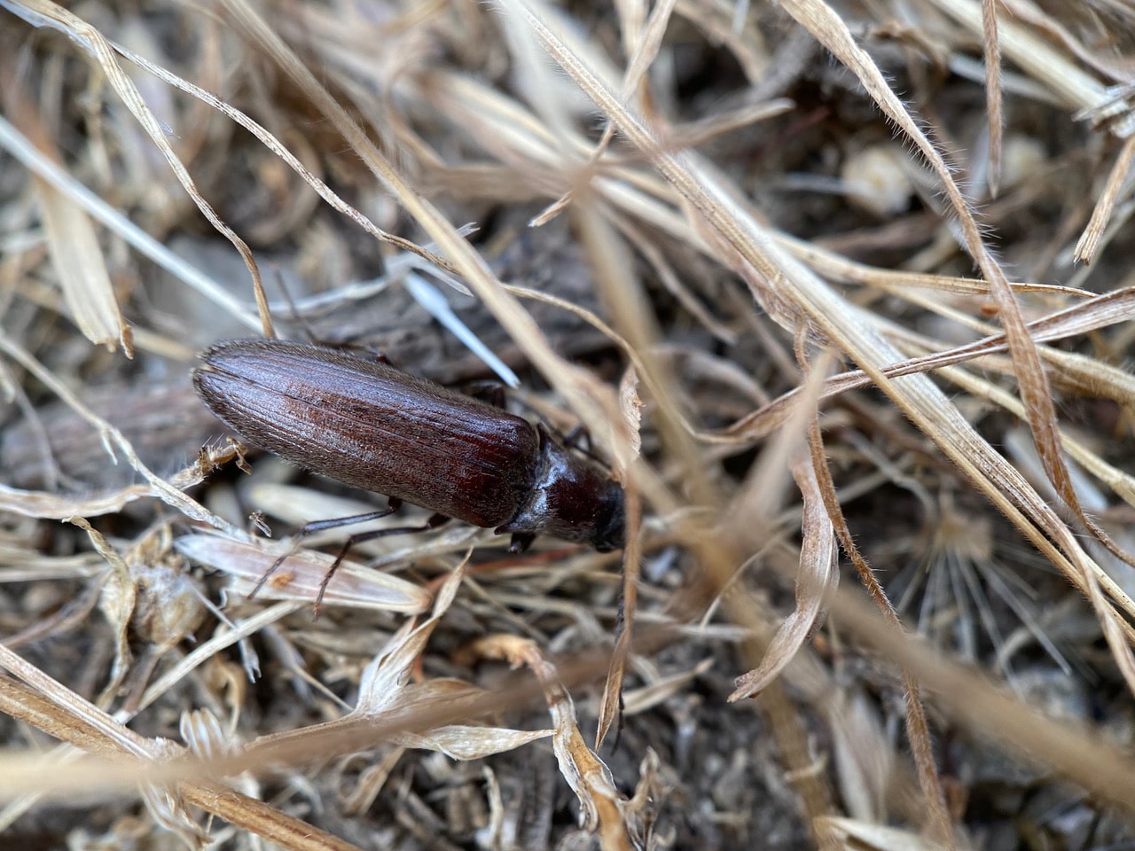 A Click Beetle (family Elateridae) crash-lands into the undergrowth of dry grass by the trail.