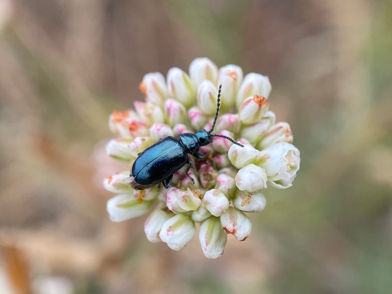 This Flea Beetle, Altica sp. (Chrysomelidae) is apparently asleep on the inflorescence of Nude Buckwheat, Eriogonum nudum. It is not running away from my camera.