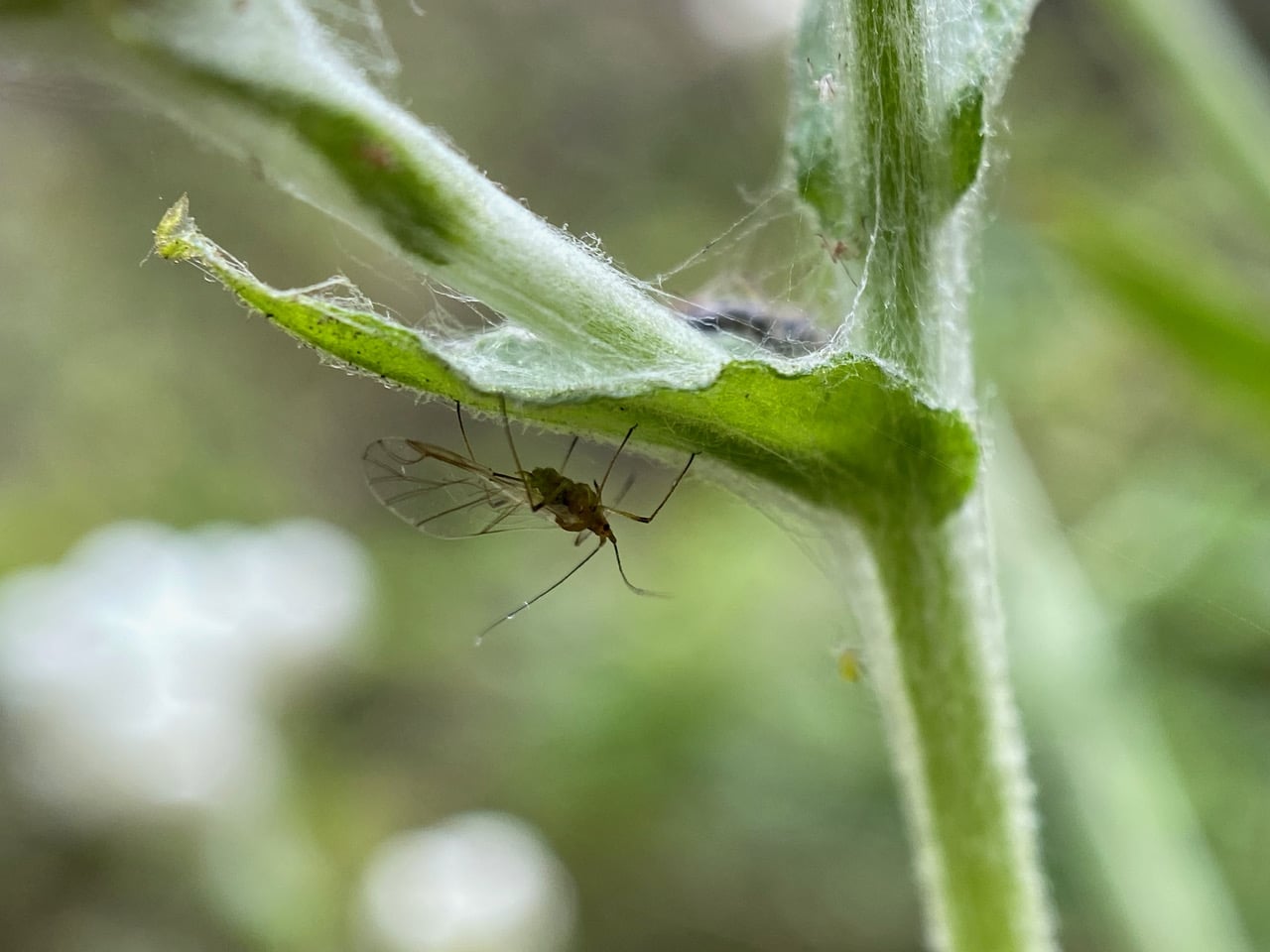 A winged aphid is resting under the leaf of California Everlasting, Pseudognaphalium californicum.