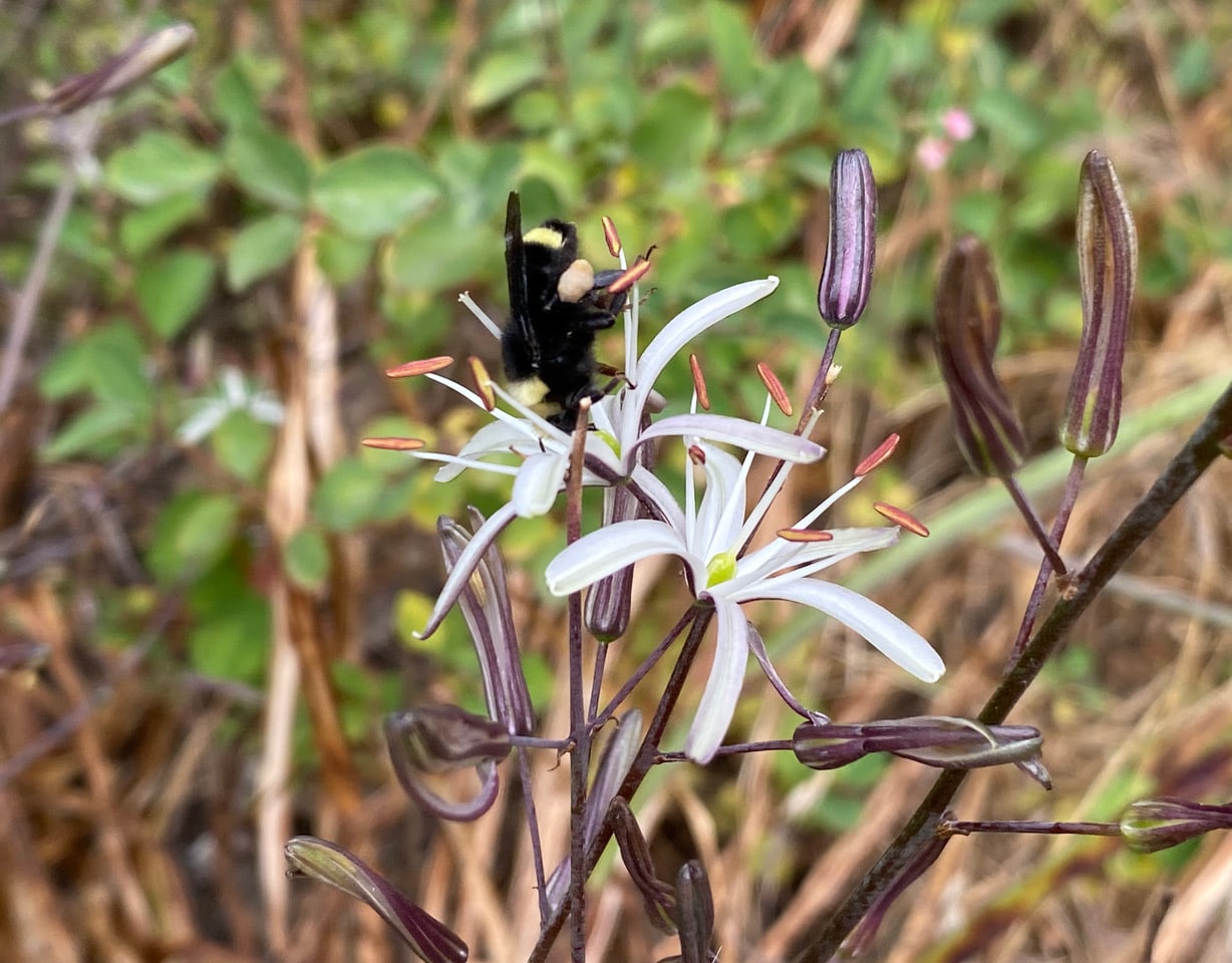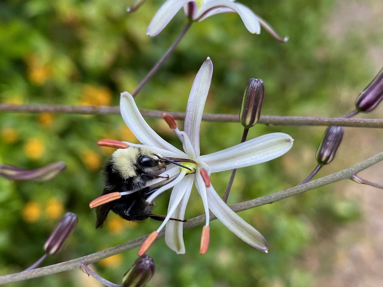 A few Yellow-faced Bumble Bees are flying around the newly open Soap Plant flowers, occasionally landing to take nectar.