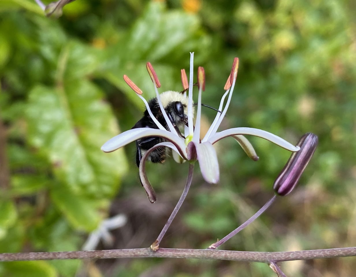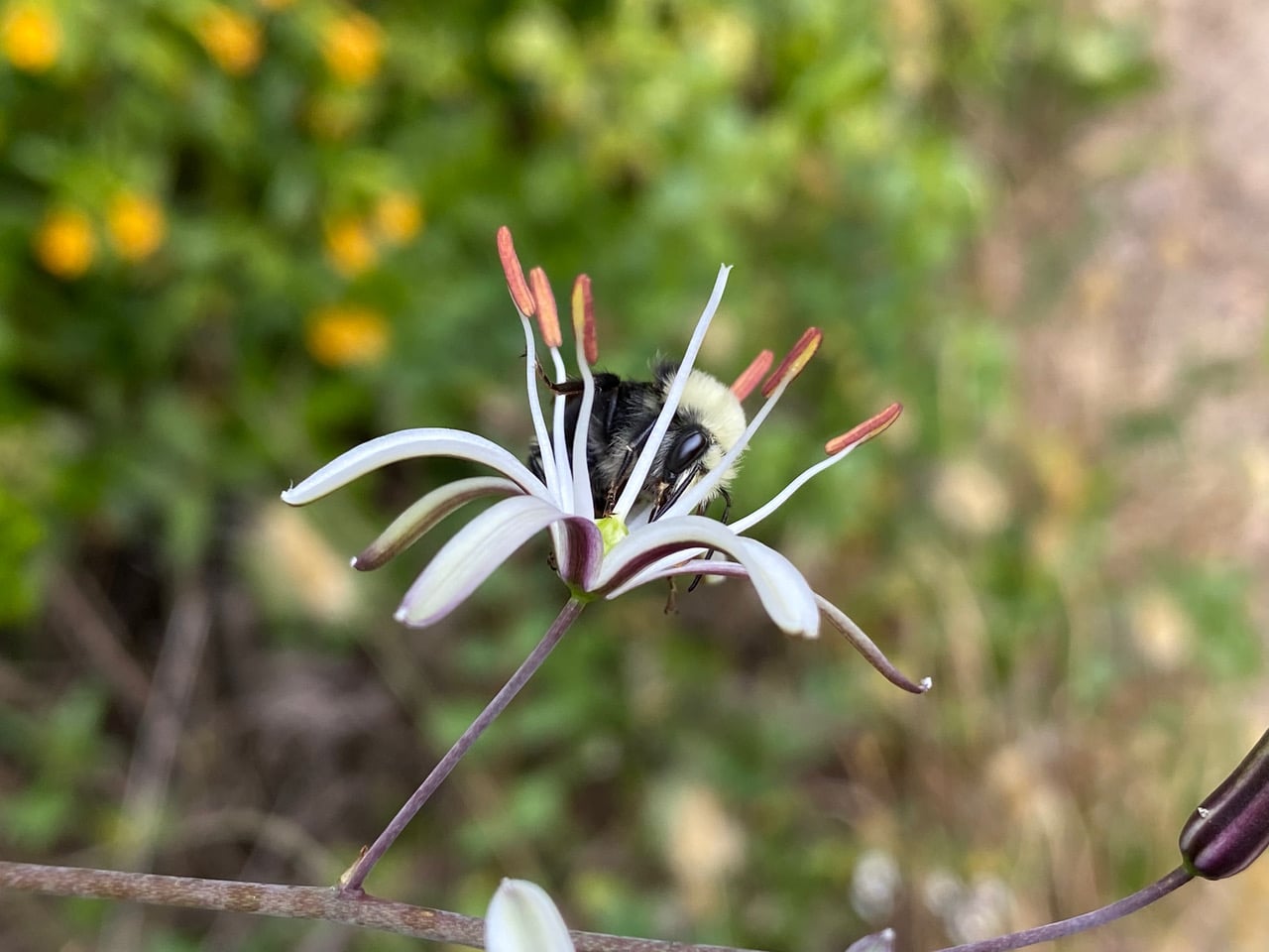 Check out that long tongue! It is soaking up the nectar at the base of the flower under the green ovary. I am delighted to observe the Bumble Bees’ antics and agility around the Soap Plant flowers. They can access the sweet stuff from any angle.