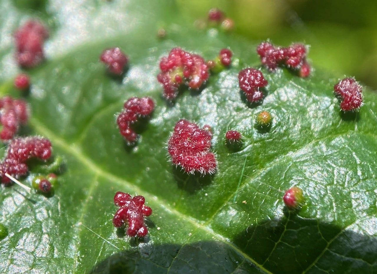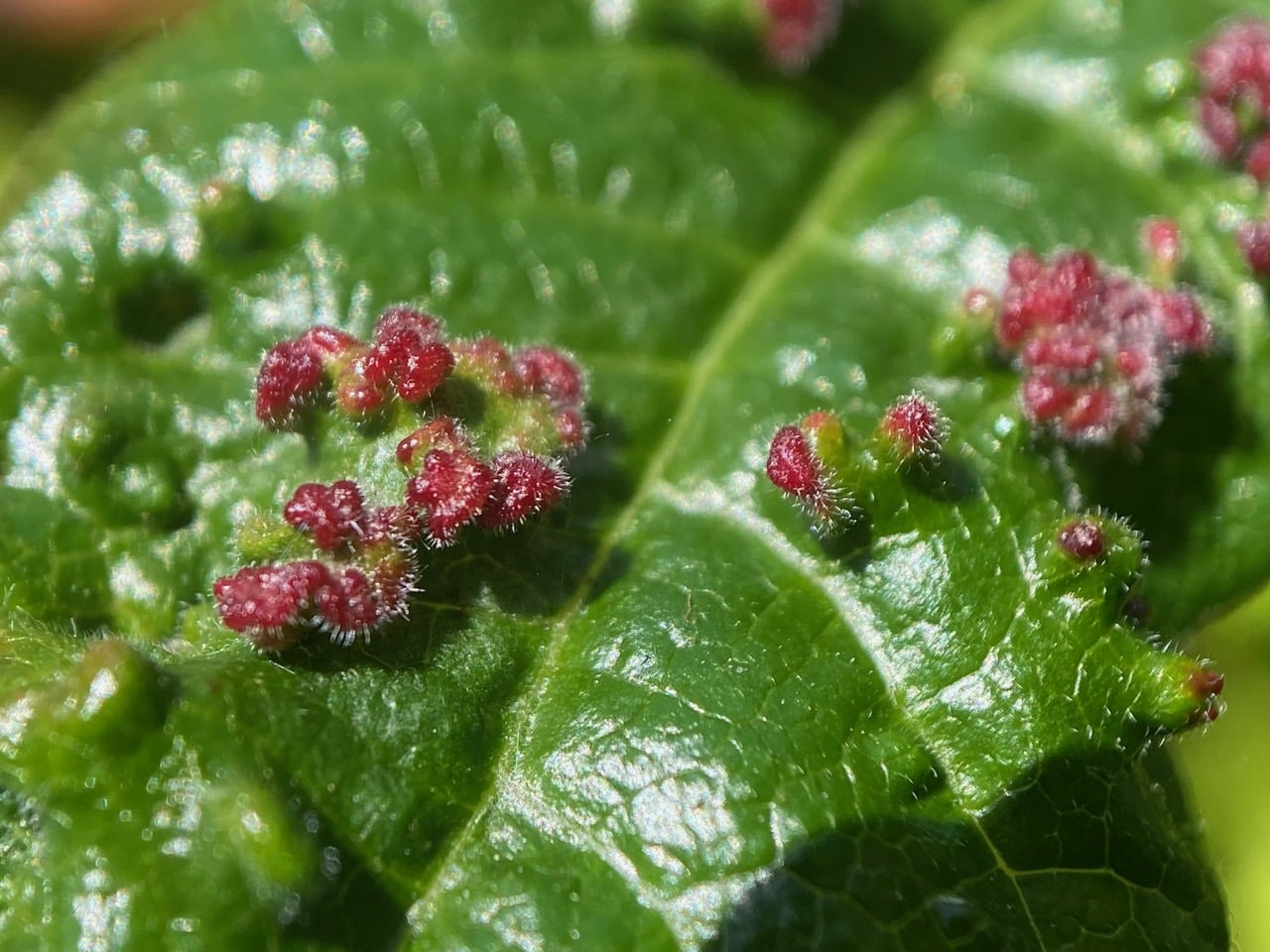 The wrinkled red growths are covered with short white hairs. These growths are leaf galls induced by Gall Mites in the family Eriophyidae.