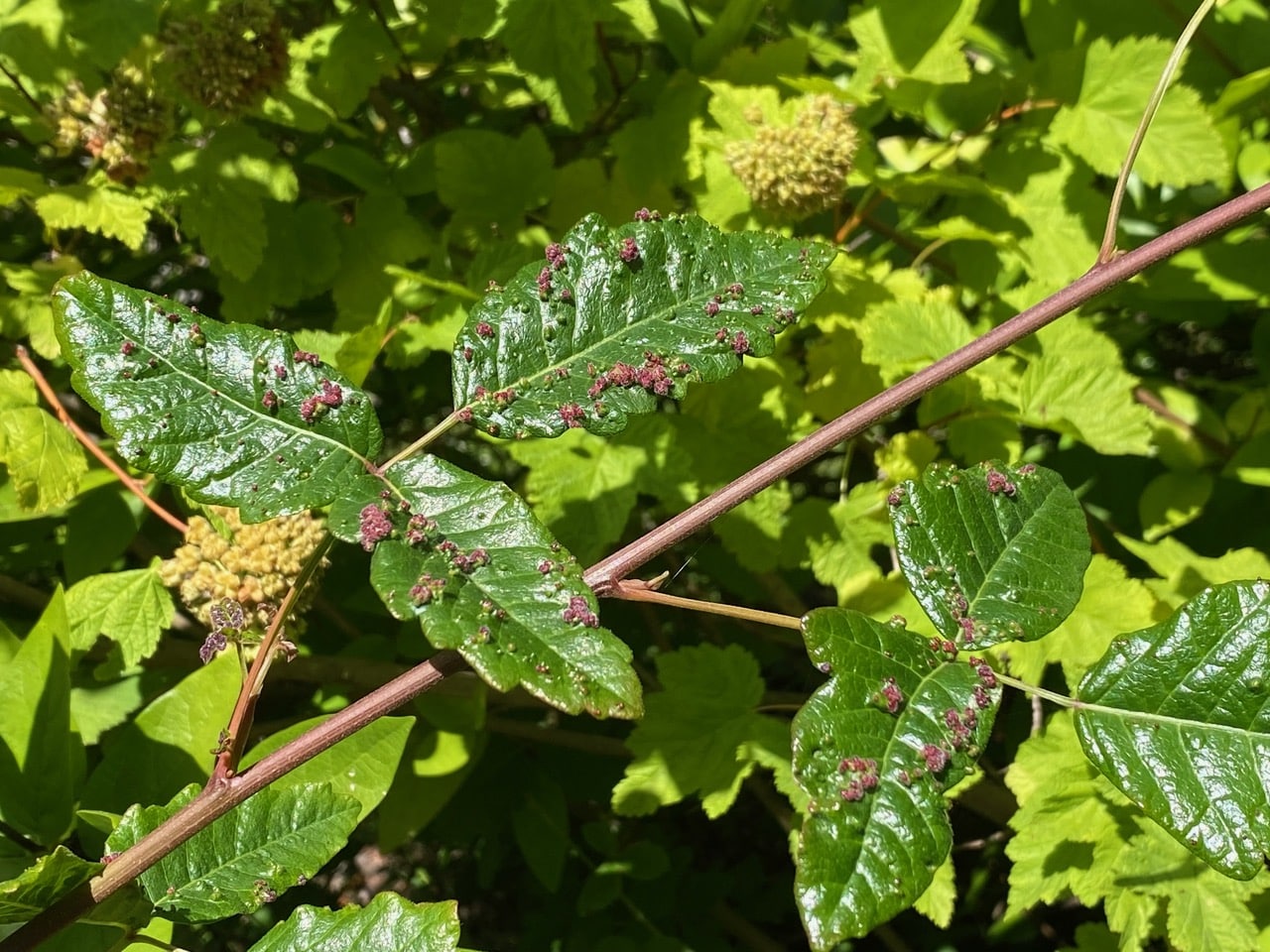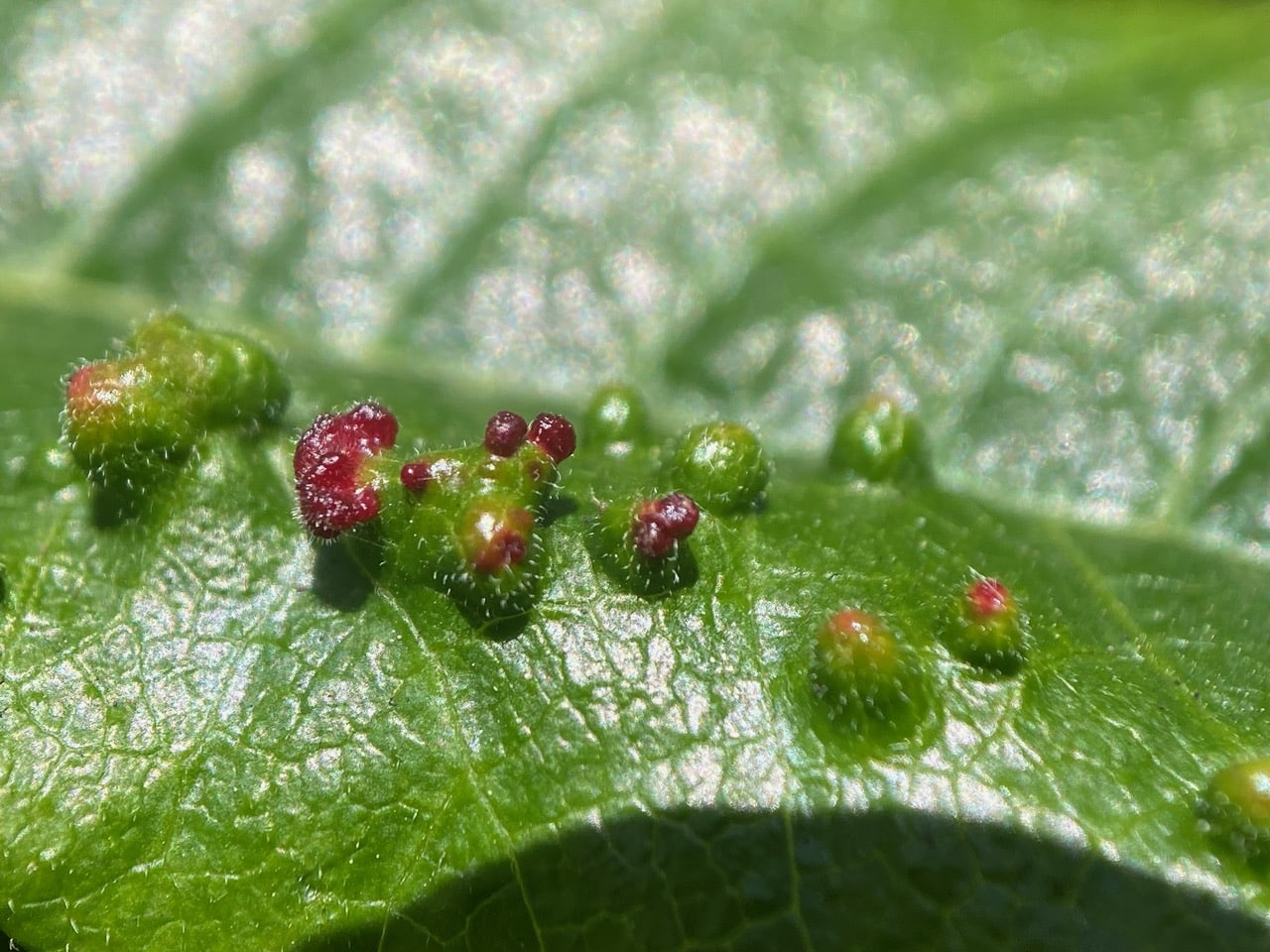 Close-up of the unsightly growths on the Poison Oak leaf shows that they first erupt as tiny green bumps on the upper surface of the leaf.