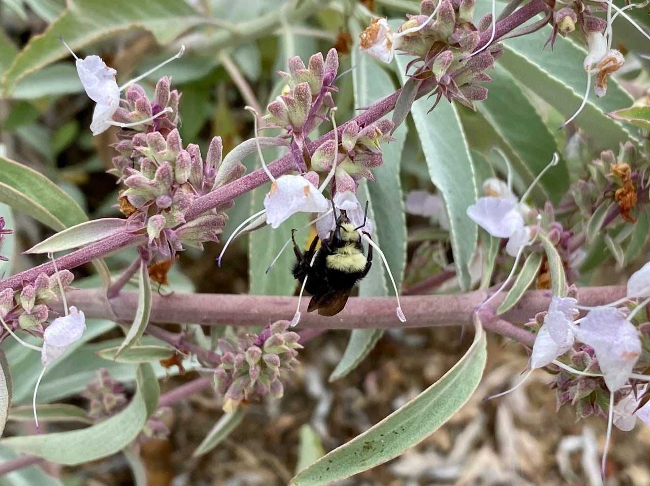 By its sheer weight, the bumble bee has lowered the lower lip of the White Sage flower when it lands, opening up access to the nectary.