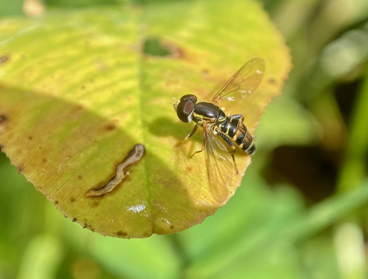 Toxomerus is a very large genus of Hover Flies. They are found in North and South America. The majority of species are only 6-9 mm in length. They are notable for their mimicry of stinging Hymenoptera to avoid predators. Their unique abdominal patterns are diagnostic at the species level within the genus. There is marked sexual dimorphism – the females have a broader abdomen with lighter coloration and pattern. Most larvae feed on soft bodied insects, such as aphids; a few feed on pollen. Adults feed on the pollen of a wide range of flowers. A female can lay up to hundreds of eggs at a time and will place them where prey or pollen food sources are readily available. They can be found in a wide variety of habitats, often in dense ground cover.