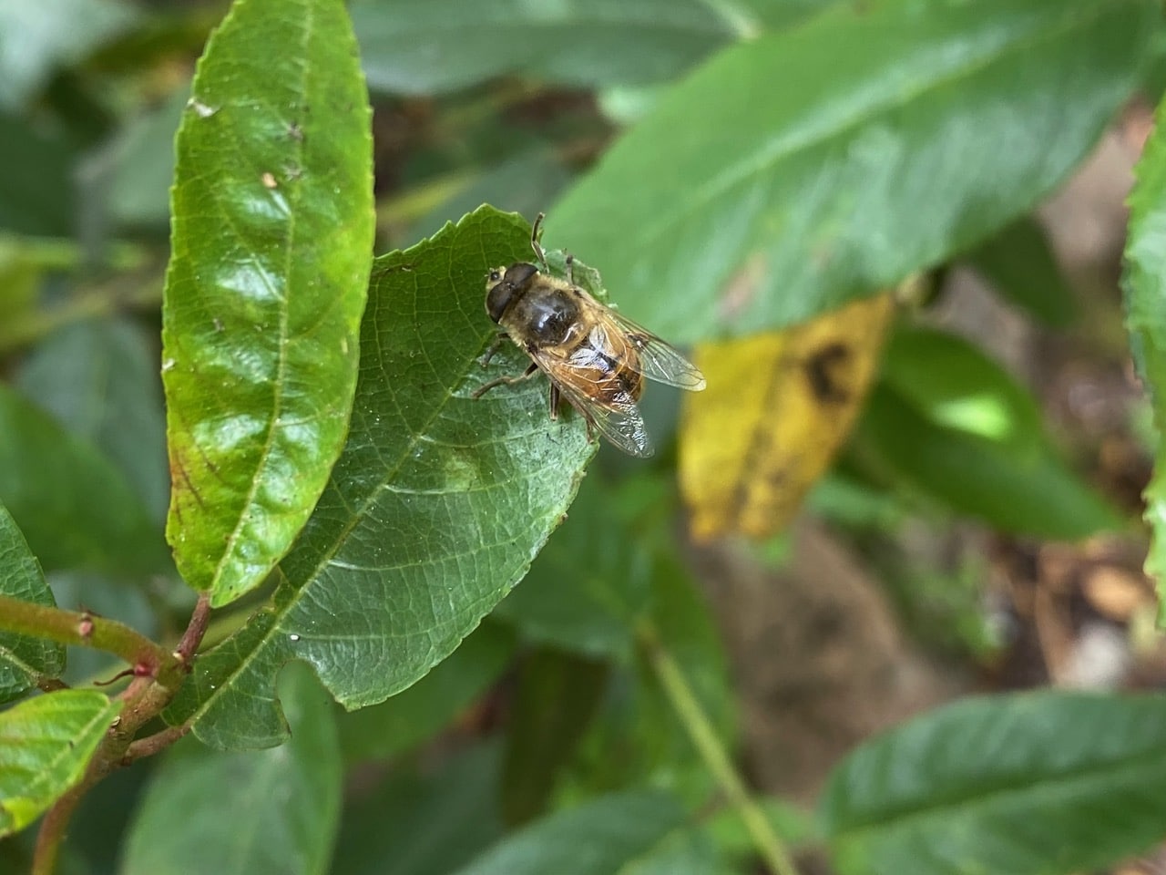 A Common Drone Fly, Eristalis tenax (family Syrphidae) is perched on a leaf of Coffeeberry in the shade, seemingly asleep.