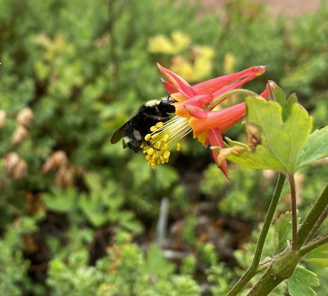 Her body wrapped around the protruding reproductive parts of the Columbine flower, a Yellow-faced Bumble Bee is sticking its long tongue into the corolla to access the nectar in one of the flower’s spurs.