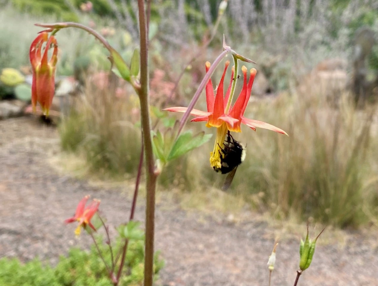 At first glance, a columbine flower looks like a Dr. Seuss creation. Closer inspection reveals it to possess the basic parts of a ‘standard flower’. Like all columbines, this species has a five-petalled flower with unusual “spurs” on the top. Each spur is formed by one of the five petals, curling into a cylinder as it rises. The lower ends of the petals join into a circle, within which are the yellow pollen-bearing stamens protruding beyond the corolla. Instead of being green as in most flowers, the sepals are red, and extend out at right angles when the flower opens. The filaments flex backwards as the anthers ripen to release pollen. The pistils (female parts) protrude beyond the anthers in older flowers to receive incoming pollen. Pollination of the flower requires long-tongued insects, such as a bumble bee. To access the nectar, the insect invariable makes contact with the stamens and pick up pollen on its body. Columbine flowers are also a popular source of nectar for the hummingbirds that can hover under the hanging flower without perching while nectaring. The birds can pollinate the flowers as pollen is often transferred from one flower to the next on their head and thorax.
