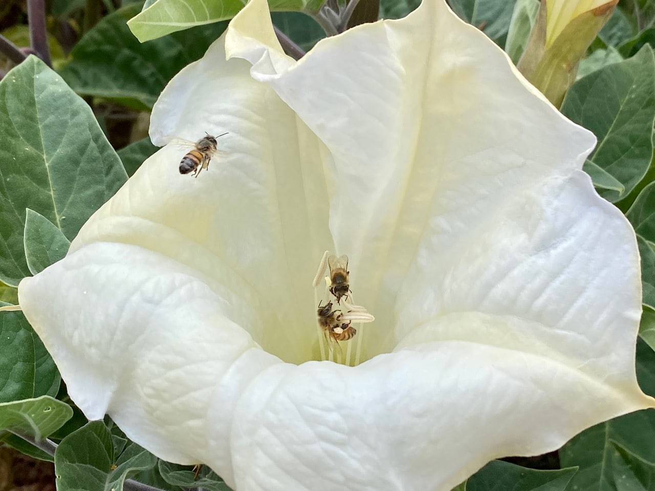 The Datura, in the garden is in full bloom. Still open in early morning, the large white fragrant flowers are eagerly visited by Honey Bees.