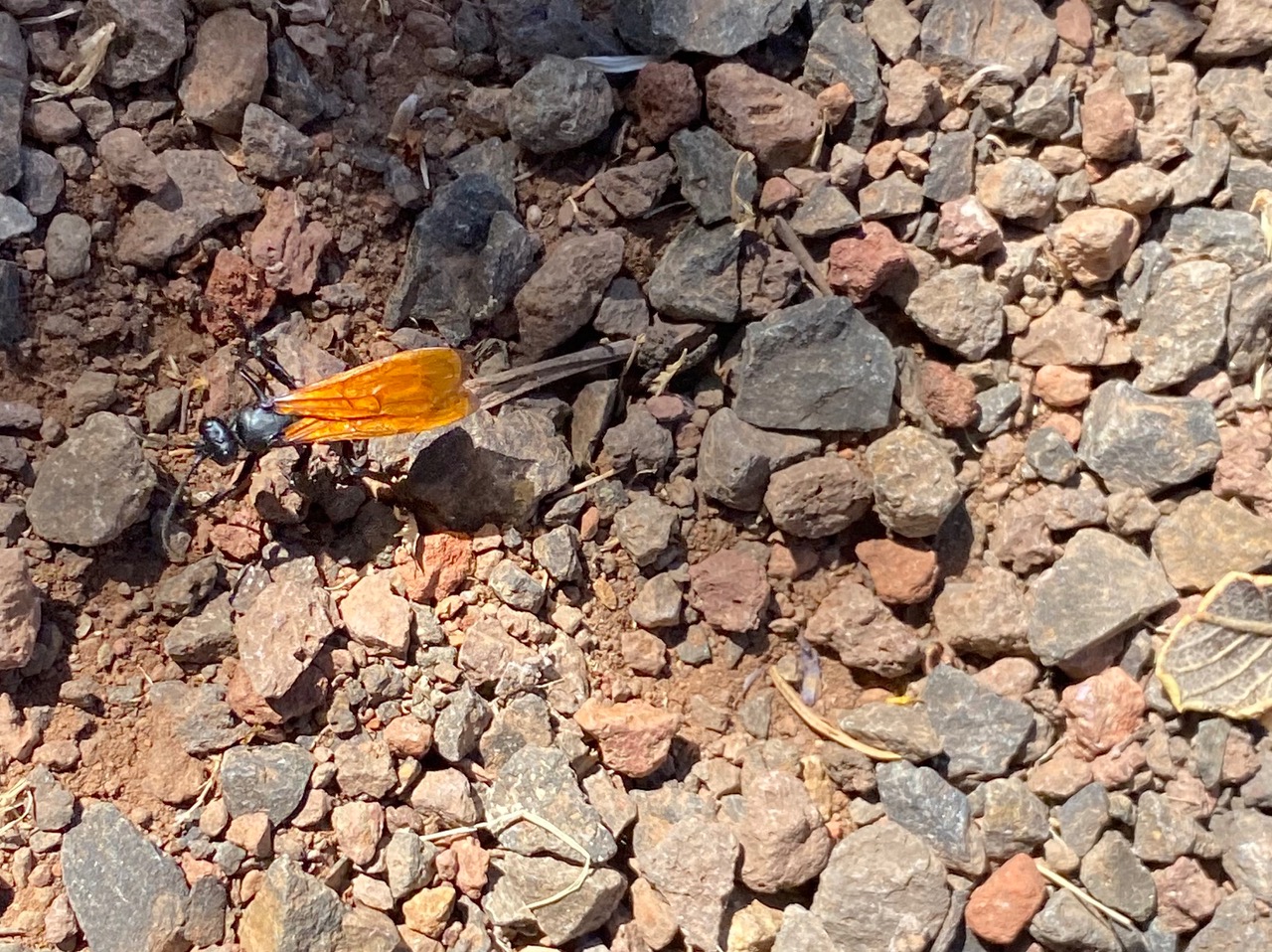 A large wasp with bright orange-red wings is running on the gravel mulch of a flower bed, peeking into every nook and cranny, seemingly looking for something. It is a Flamed Tarantula-hawk Wasp, Hemipepsis ustulata (family Pompilidae). Is it on the hunt for tarantulas?
