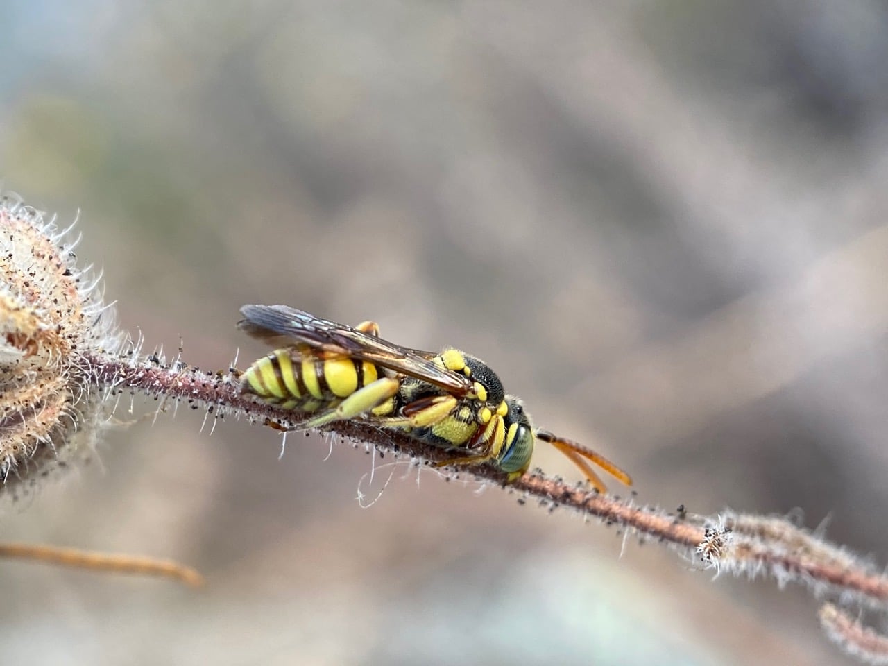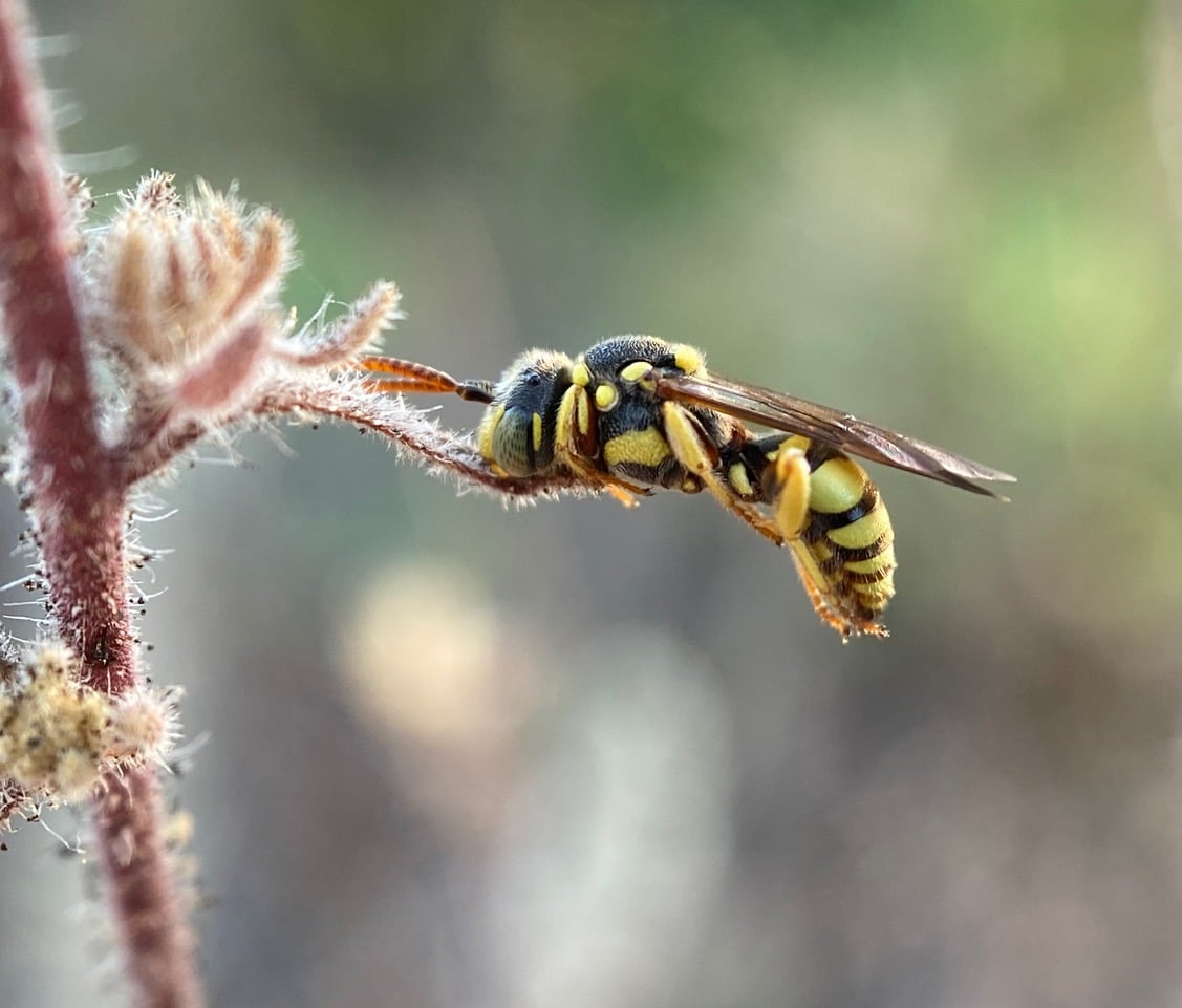 This is the Cuckoo Bee, Nomada suavis (family Apidae) right under the seed head on which the longhorn is sleeping. It is holding onto the stem with its mandibles.
