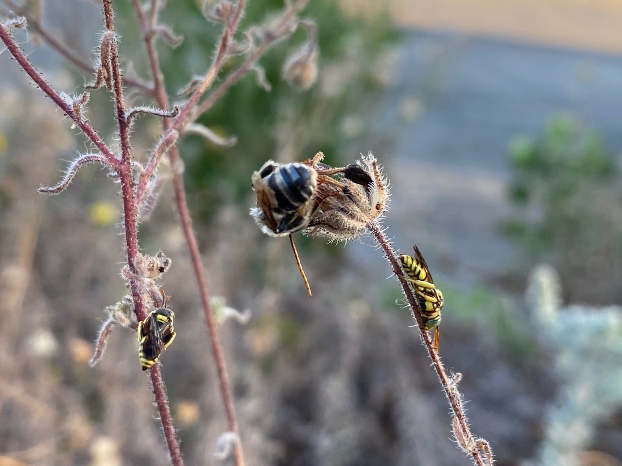 On a short withered Elegant Tarweed on the other side of the big tree, I find the two Cuckoo Bees sleeping in the same vicinity where I saw them yesterday, just inches off the ground. This time in the company of a single sleeping male longhorn! What is the attraction here? Cuckoo Bees and their host bee? Did they emerge from the same nest? Why is this longhorn male sleeping away from the others of his kind?