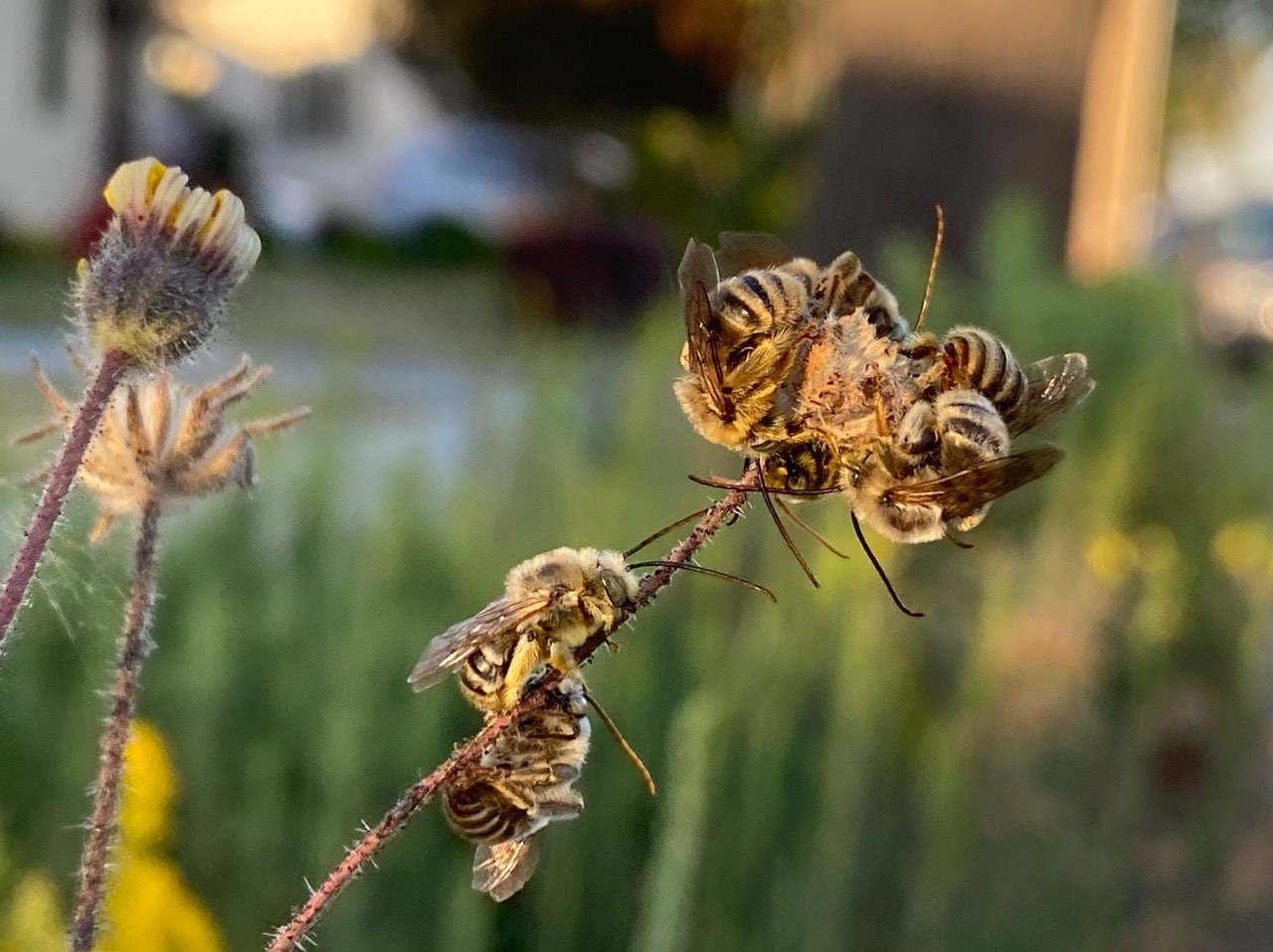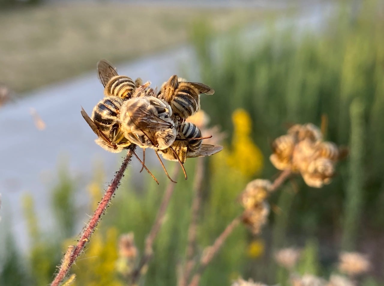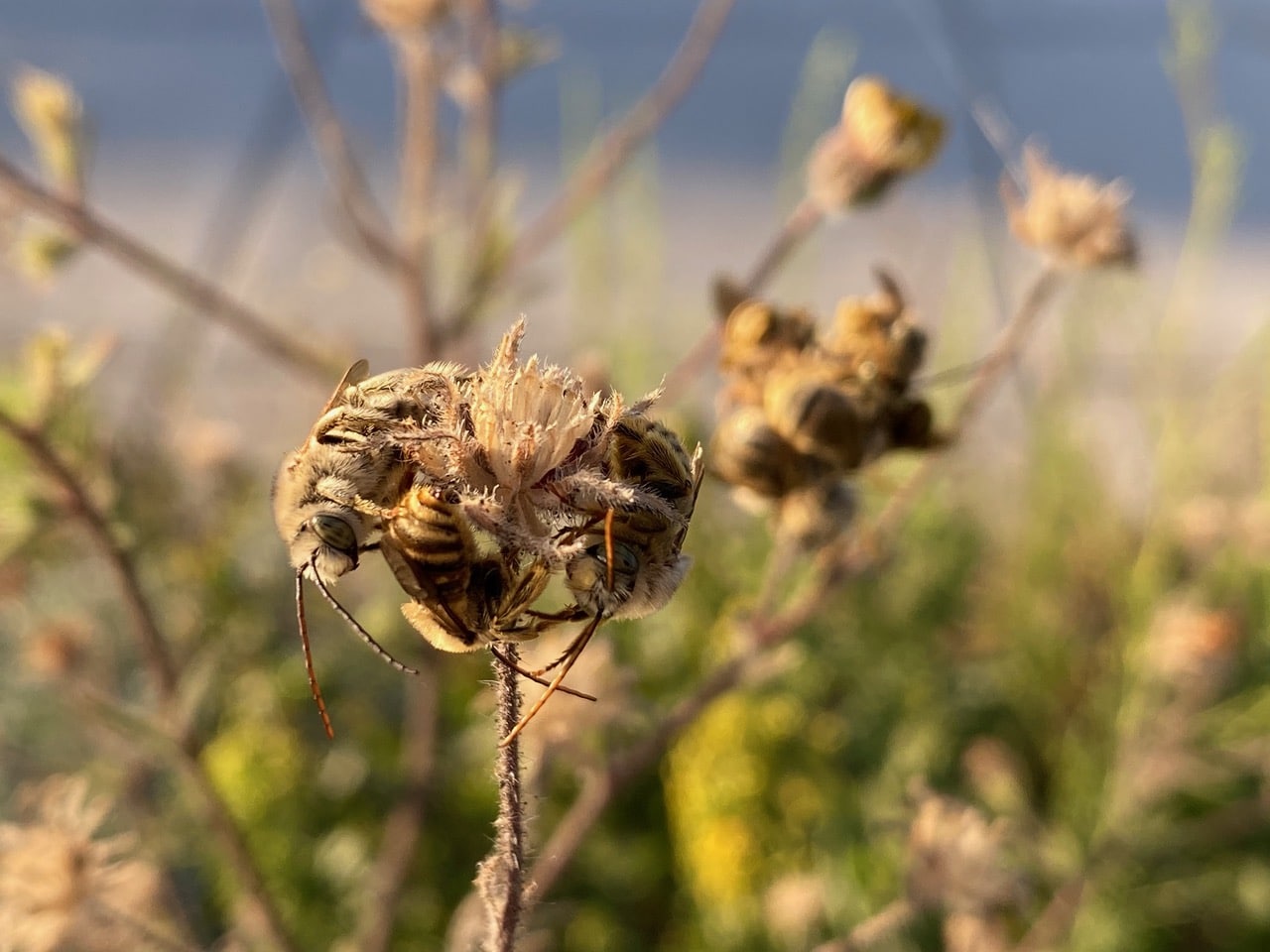From my past experience with male Summer Longhorn Bees, Melissodes sp. (family Apidae), I know that they gather to sleep in aggregation at around 5 pm in the summer. At 7 pm on this fine day, I decide to make a quick trip to the parking strip in Alameda where I have seen them foraging on the Elegant Tarweed, Madia elegans yesterday.