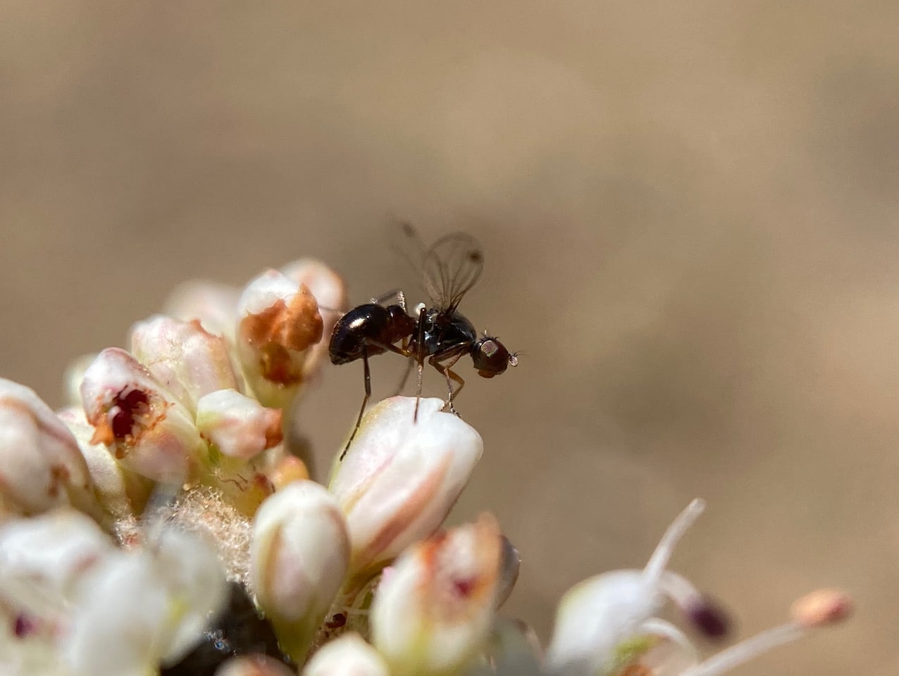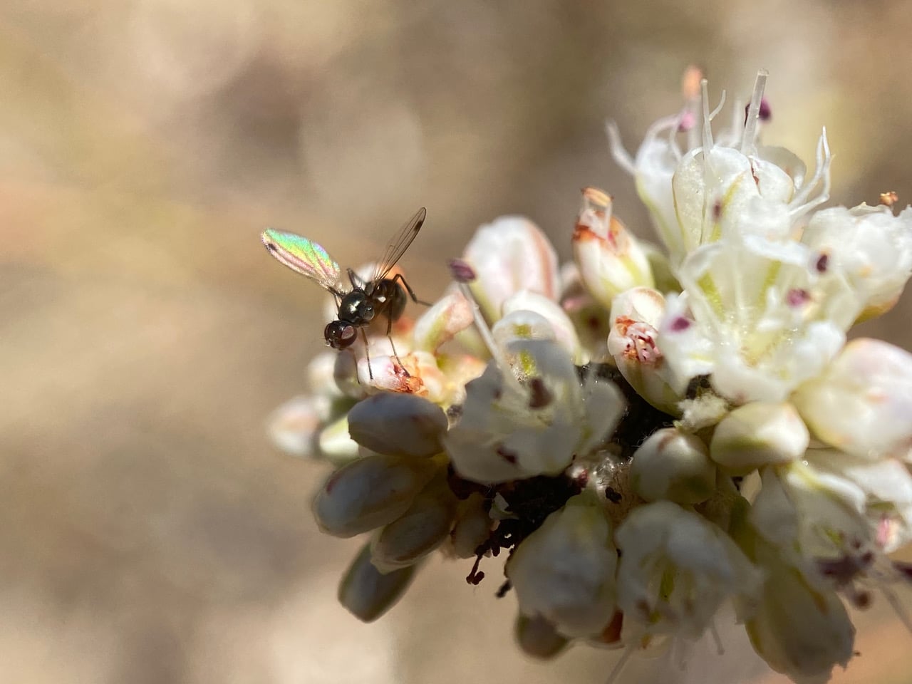 Who’s that tiny glossy critter that is waving its wings as it moves around on the Nude Buckwheat flowers?