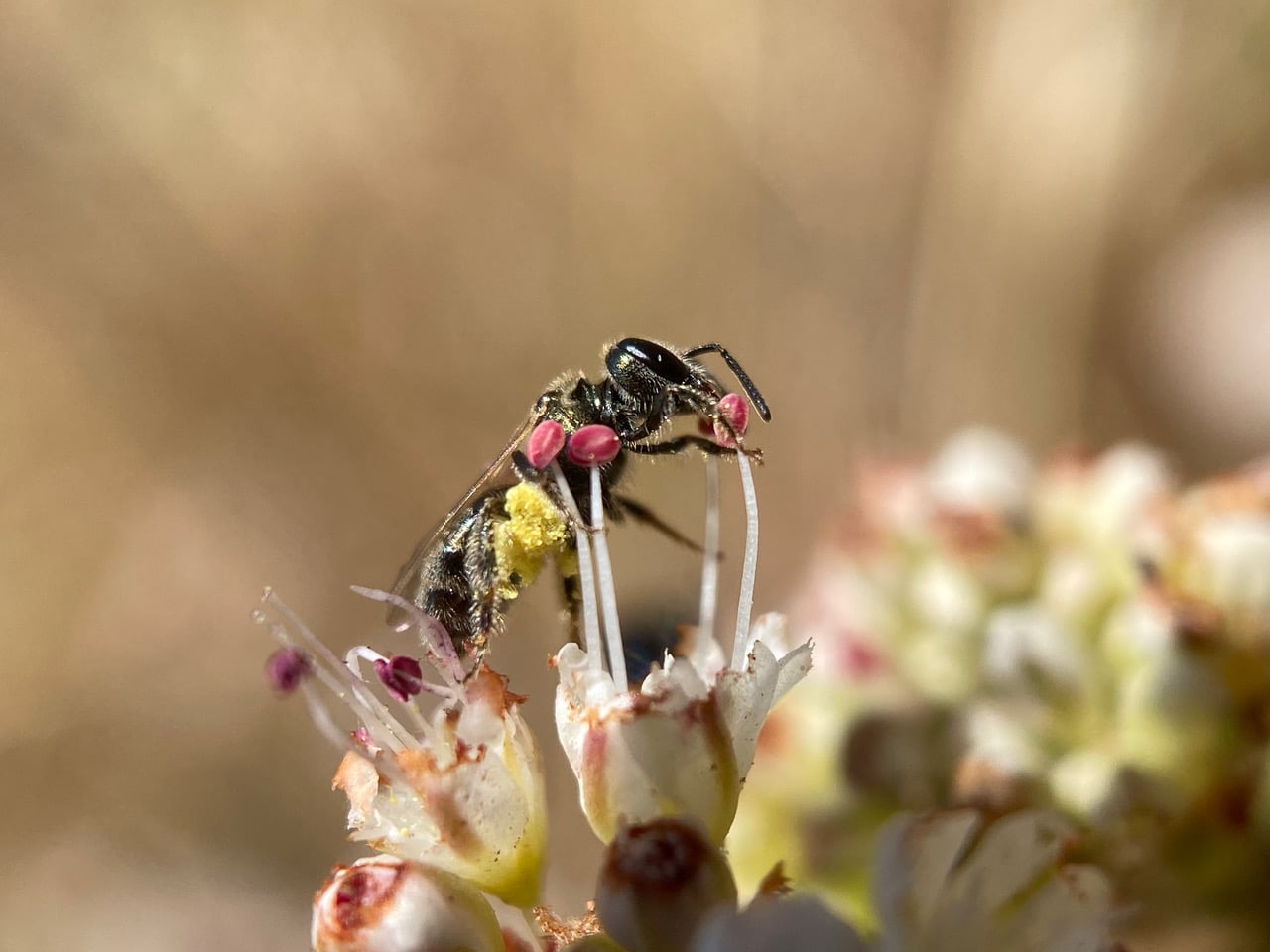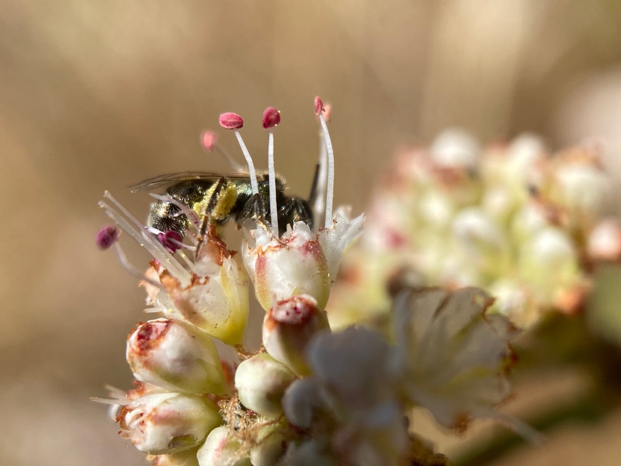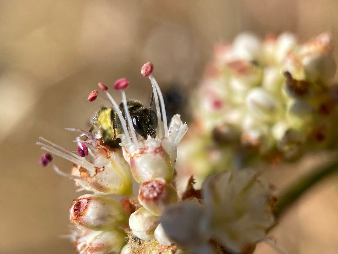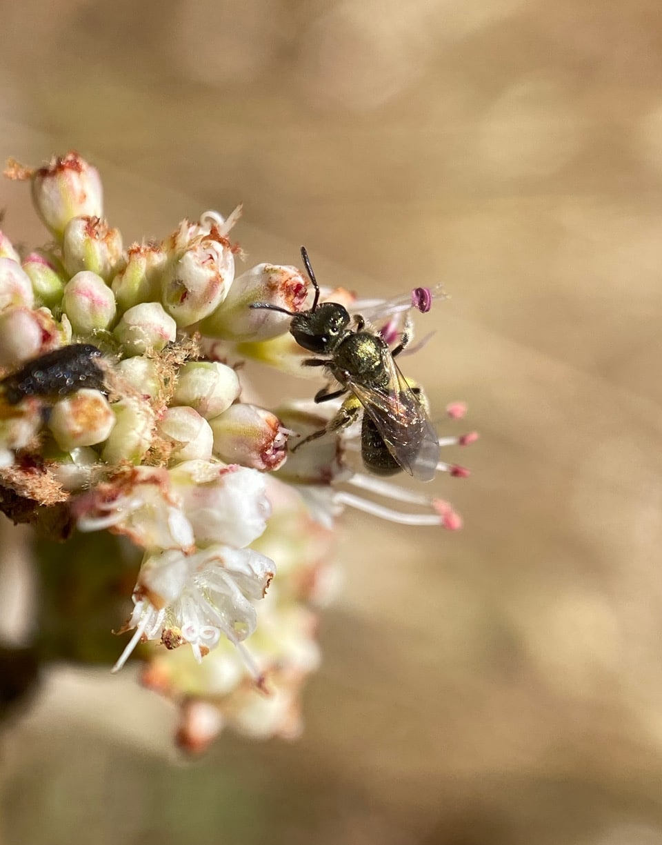Hanging on the stamens, a tiny Metallic Sweat Bee, Lasioglossum (Dialictus) sp. (family Halictidae) is collecting pollen from the anthers of a Nude Buckwheat flower.