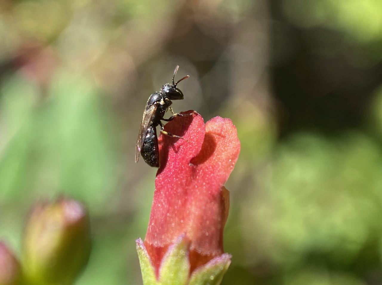 Ooh, that’s a different little bee on the Bee Plant flower! It is a female Masked Bee, Hylaeus sp. (family Colletidae). Note the sliver of yellow marking next to her eye, and the absence of any scopa (pollen collecting hairs) on her body.