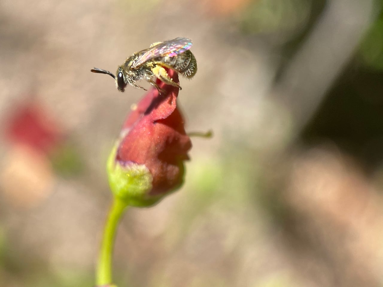 A metallic Sweat Bee, Complex Lasioglossum pilosum (family Halictidae) climbs on top of a flower of California Bee Plant, Scrophularia californica.