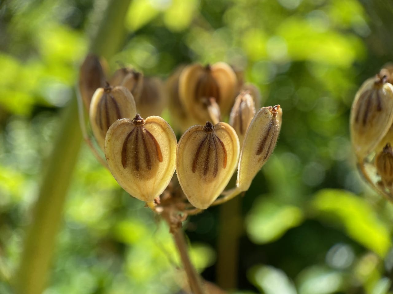 Backlit by the sun, the oil tubes show up prominently on these Cow Parsnip fruits.
