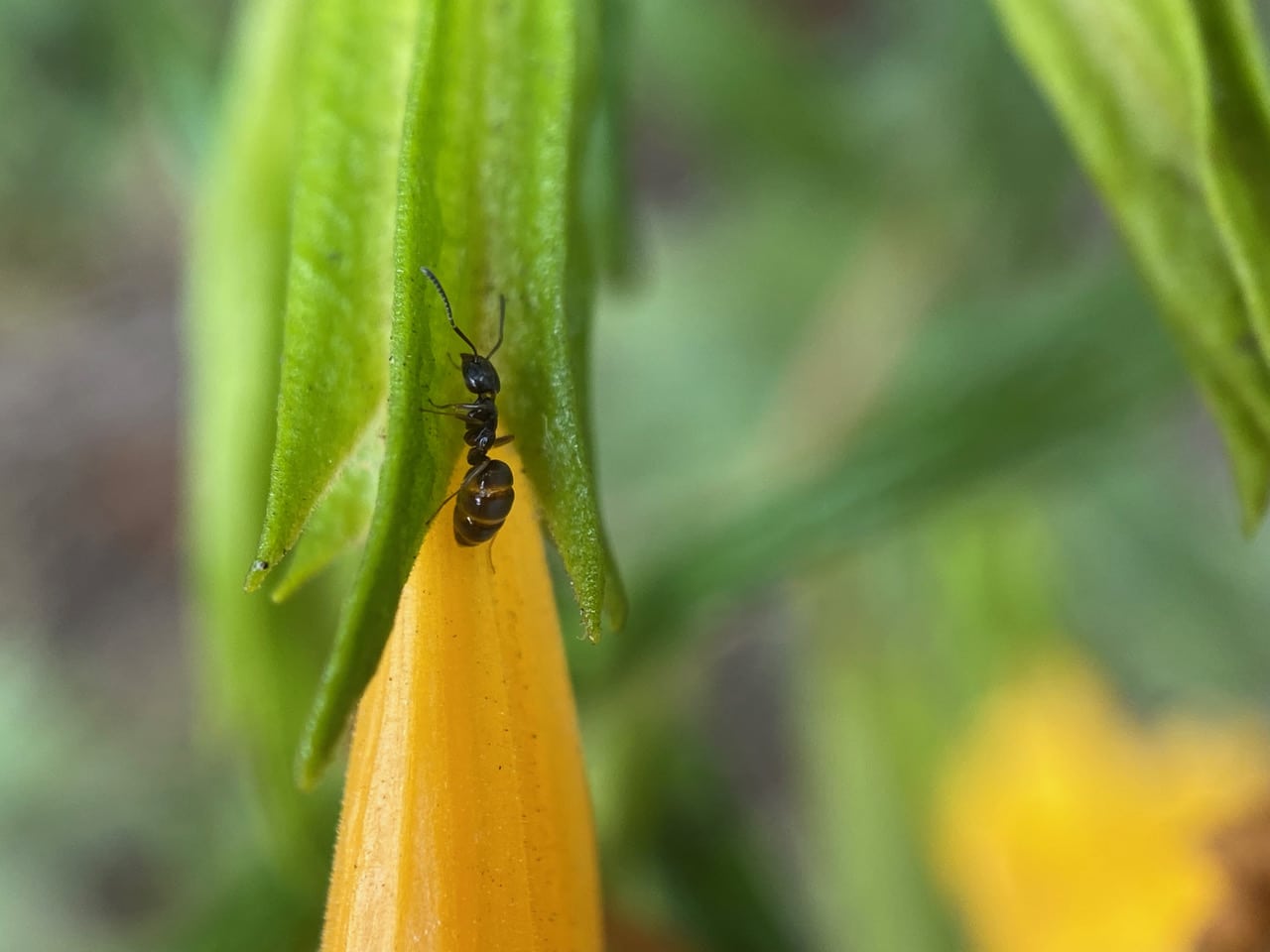 An Odorous House Ant, Tapinoma sessile (family Formicidae) is exploring the outside of a Sticky Monkeyflower.