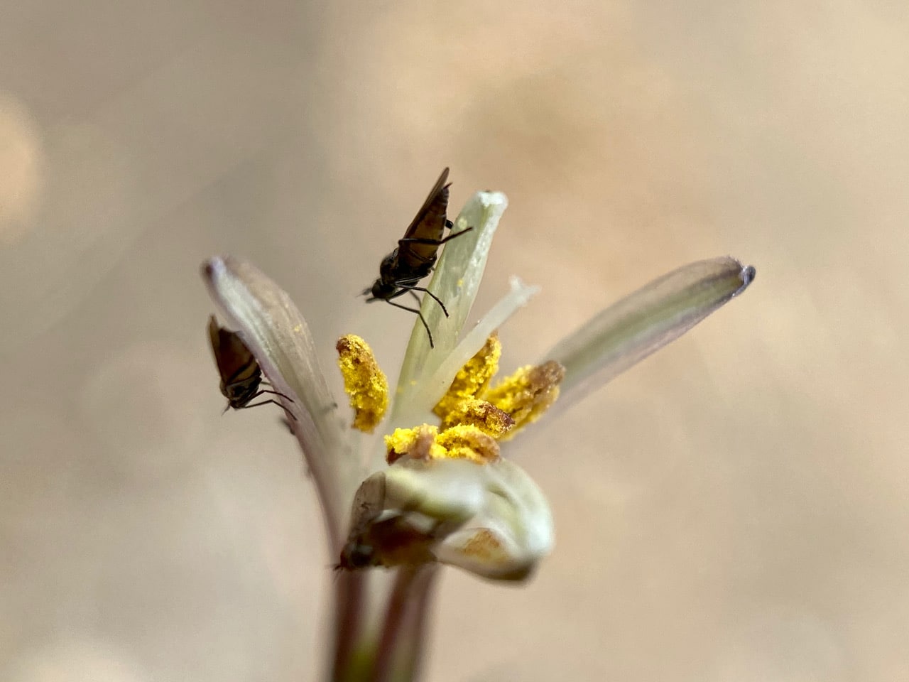 Some Dance Flies (family Empididae) are still hanging on the petals of the Soap Plant flowers that have not fully closed.