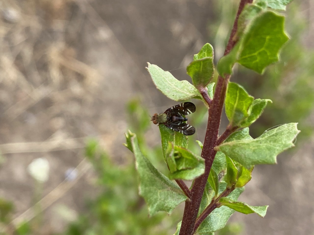 Ooh, that’s a Desert Broom Gallfly, Aciurina thoracica (family Tephritidae). It’s large dark picture wings are visible from a distance, especially if the fly is waving them. This species of fruit flies is known to induce galls on Baccharis sarothroides in southern California. I think the flies also lay eggs on our Coyote Brush, Baccharis pilularis.