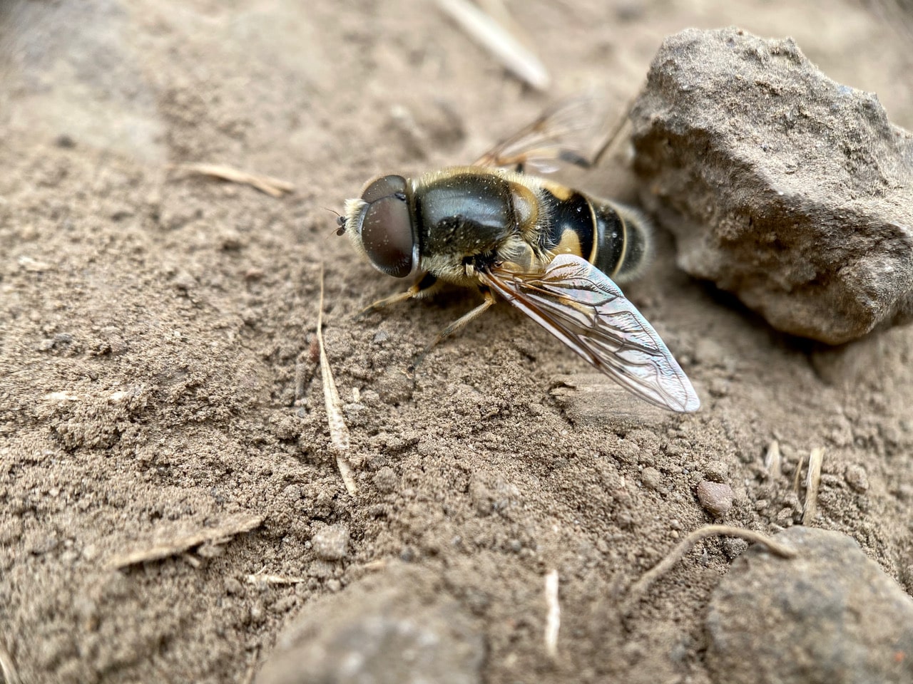 A Black-footed Drone Fly, Eristalis hirta (family Syrphidae) lands on the trail and remains there, motionless. It is rather unusual for this species of hover fly to land on the ground. It does not appear to be injured. Perhaps grounded by the cold and the wind?