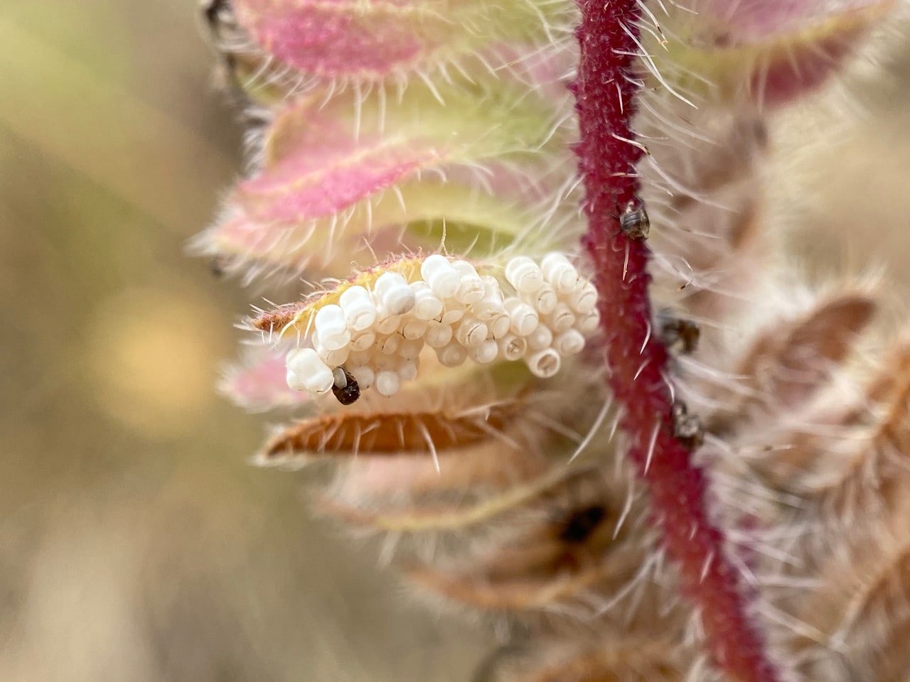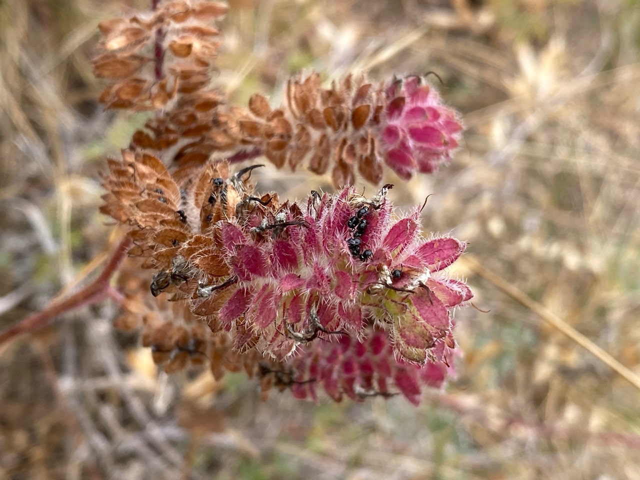 Some Phacelia seed heads have turned a beautiful pinkish-mauve color. What are those black spots on the bracts? They seem to be moving.