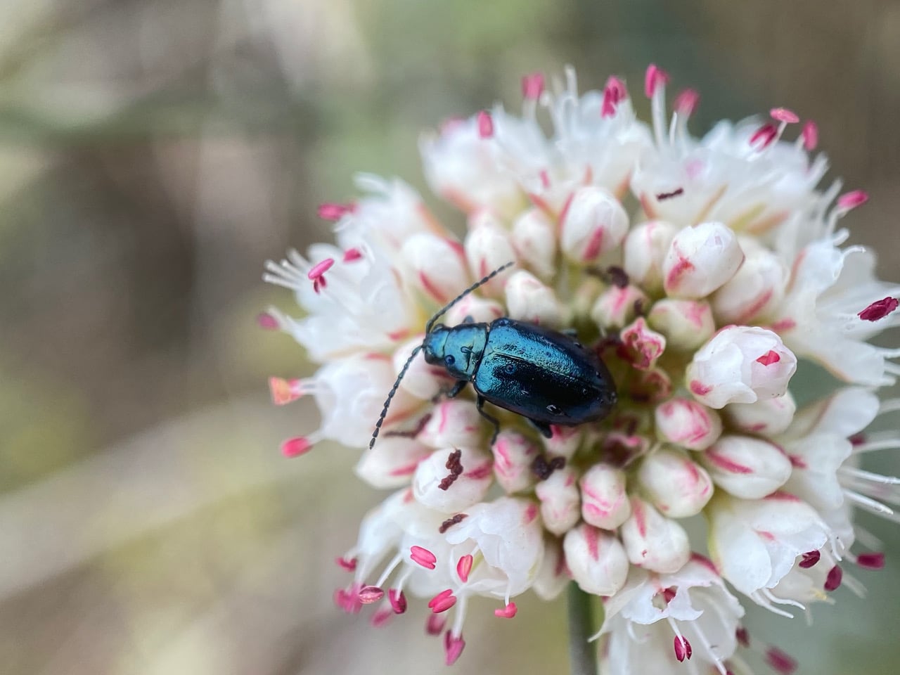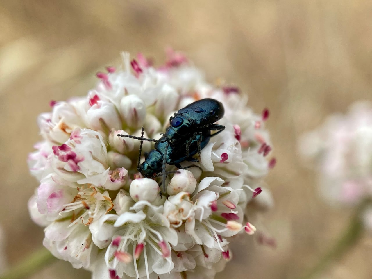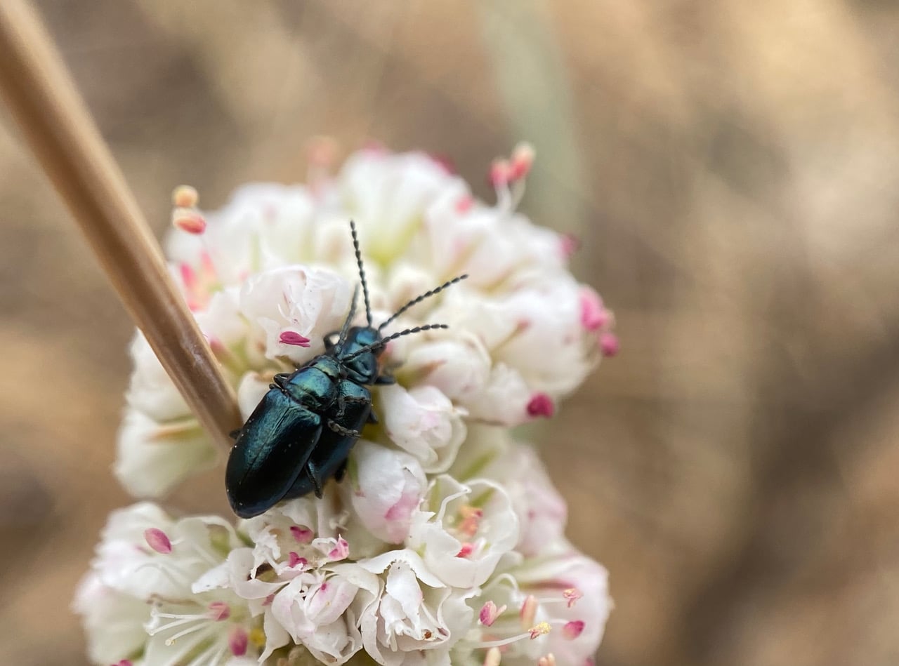 Water droplets have condensed on the Flea Beetle, Altica sp.(family Chrysomelidae) on an inflorescence of Nude Buckwheat, Eriogonun nudum.