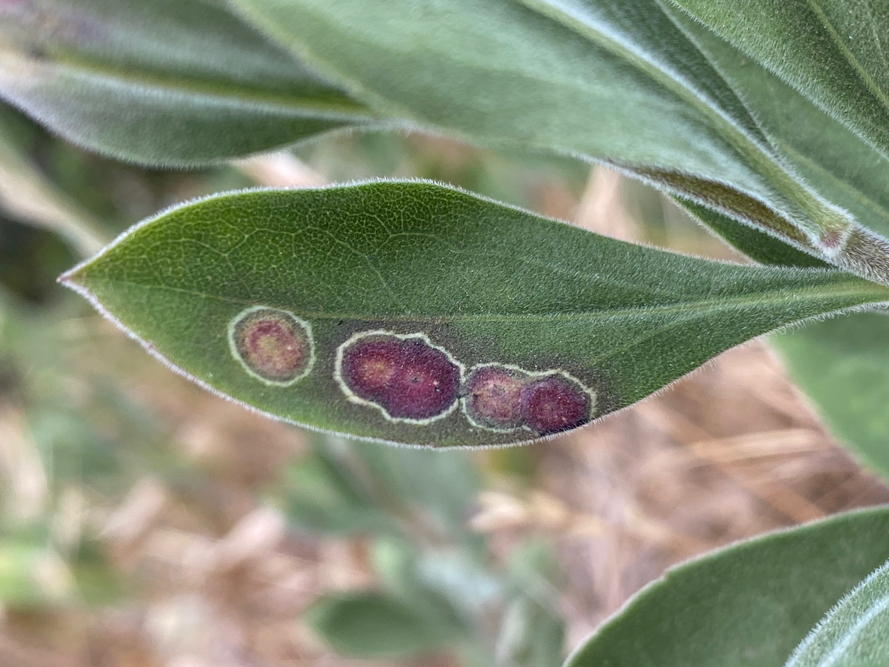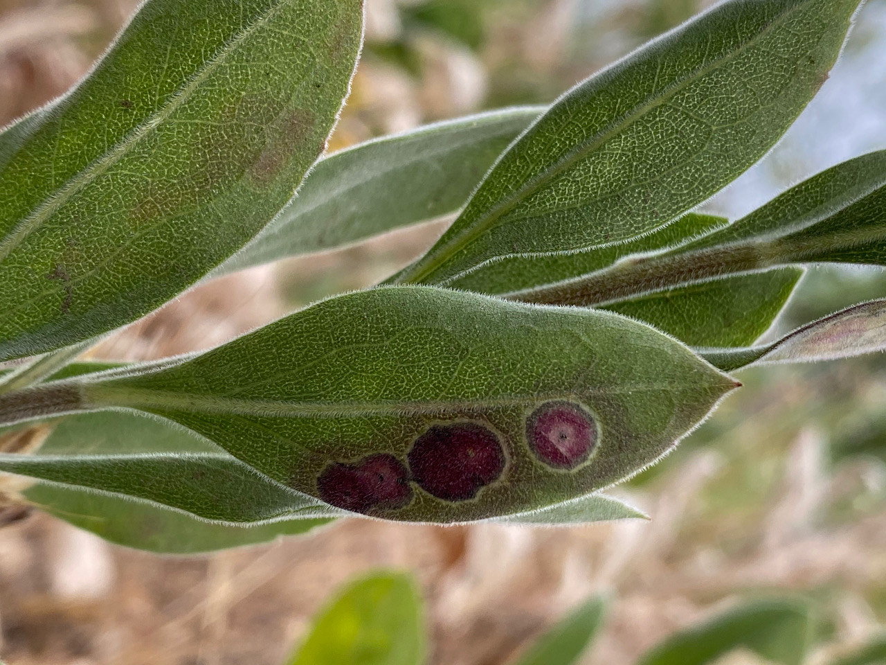Close to Diablo Bend, I find these round, colorful blisters on some of the leaves of Calfornia Goldenrod, Solidago velutina ssp. californica. This is what is visible on the underside of the leaves.