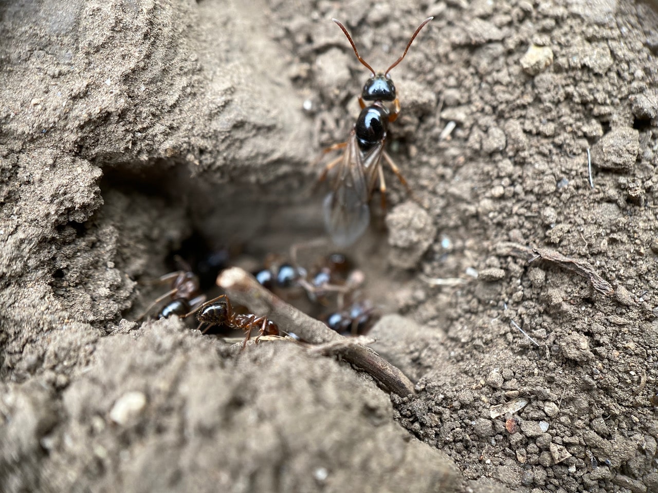 An excited group of Field Ants, Formica subpolita (family Formicidae) are gathered at the entrance of their nest at the edge of the trail. The small workers seem to be moving soil particles to clear or widen the path, while larger alates (winged reproductives) step out cautiously to test the air, waving their long antennae. Perhaps a nuptial flight is imminent?