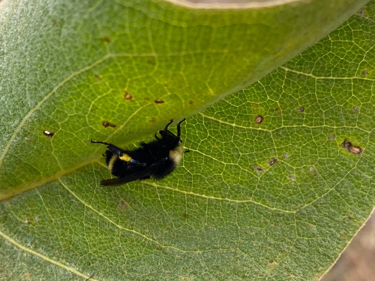 It is still foggy and cold, and the winds have picked up. Even the bumble bees are succumbing to the weather. This Yellow-faced Bumble Bee, Bombus vosnesenskii is taking a nap in the shelter of a Coyote Brush.