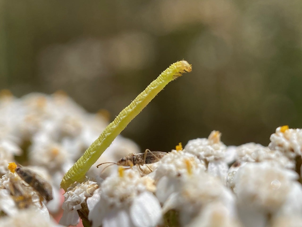 Just as Stefanie and I are sharing our observations that the flowers of Yarrow, Achillea millefolium seem to have few insect visitors this year, I spot a tiny Inch Worm that has reared up stiffly among a Yarrow inflorescence. Taking a closer look, I realize that the caterpillar has assumed this pose in response to the approach of some Seed Bugs, Nysius raphanus (family Lygaeidae).